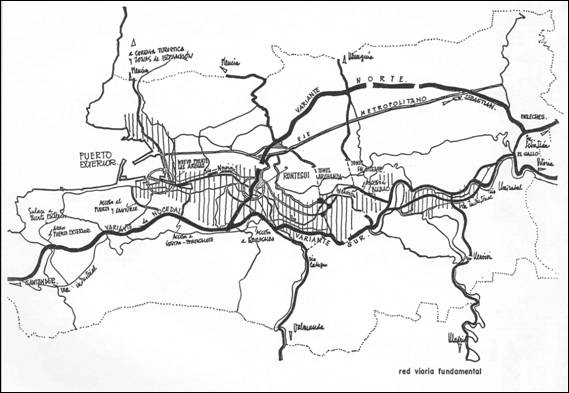 En el caso de la CAPV caben destacar las reflexiones realizadas ya en la década de los veinte por el arquitecto R. Bastida[29] sobre Bilbao en un ciclo de conferencias sobre el futuro urbanístico de Bilbao. En las mismas el arquitecto defiende una visión supramunicipal para poder dar respuesta a los problemas del municipio de Bilbao. R. Bastida, partiendo de una rigurosa crítica del urbanismo, del planeamiento realizado a partir del Proyecto de Ensanche de Bilbao, ya señalaba la necesidad de un planeamiento de la ciudad completa, de un “Plan de Conjunto que forme un todo armónico”, entendiendo la integración de Bilbao en la cuenca del Nervión desde Galdácano hasta el Abra, es decir con una visión supramunicipal de carácter comarcal. Pero no se quedó sólo en la teoría y acompañó dichas ideas de una propuesta de ordenación concreta basada en nuevas infraestructuras de comunicación que vertebraban toda la ría, y que se ha considerado sorprendentemente moderna en su planteamiento de visión territorial[30].