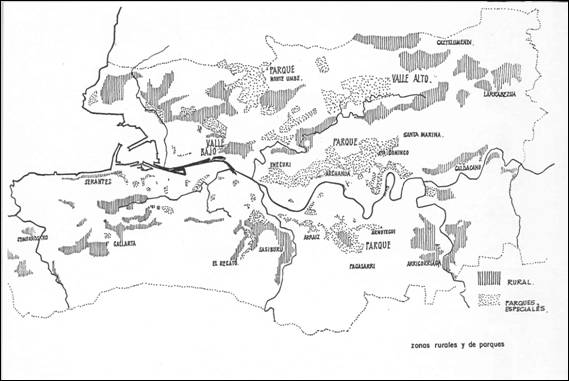 Sin llegar a ser aprobadas cabe destacarse otras experiencias en Madrid y Cataluña. En el caso de la capital del Estado ya desde la década de los veinte se estaban realizando diversos estudios para realizar un plan de expansión, y se empezaba a asentar la necesidad de incorporar la escala regional en el análisis y las propuestas. Fueron años políticamente convulsos y al final, el Plan de Extensión de Madrid, aprobado en 1933, incorporó muchas de las ideas que ya se habían propuesto para el Gran Londres. Aunque partía de una visión supramunicipal chocó con la compleja realidad político-administrativa del entorno, siendo aprobado sólo en lo concerniente al municipio de Madrid. Pero la necesidad de trabajar desde un ámbito territorial de mayor amplitud seguía latente y, a pesar de coincidir con los años de la guerra civil, en 1939 se llegó a presentar el “Esquema y Bases para el desarrollo del Plan Regional”, que podía considerarse como lo que actualmente es un documento de avance de planeamiento. Allí se recogían propuestas para Madrid muy similares a las del Gran Londres: cinturón de espacios en su entorno; desarrollo de ciudades satélites nuevas o como desarrollo de algunos núcleos ya existentes; trazado de ferrocarril y de viario que permitía unir entre sí los núcleos satélites de la periferia; propuesta de uso público de los márgenes del Jarama; protección y uso de las sierras de Gredos y Guadarrama, etc. También se señala la necesidad de desarrollar una normativa que regulase la utilización del suelo, así como su destino y utilización y el carácter de las construcciones[31].