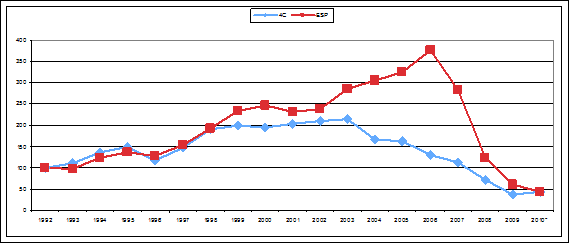 Si la comparación la realizamos con los datos reales de licencias de construcción para el período en el que sí disponemos de ambas cifras (1993-2009), se aprecian algunas diferencias tal vez debidas a la crisis inmobiliaria producida a partir de los años iniciales del siglo XXI, como se puede apreciar en la siguiente tabla. La caída de la construcción acentuaría la diferencia con las licencias de ocupación.
