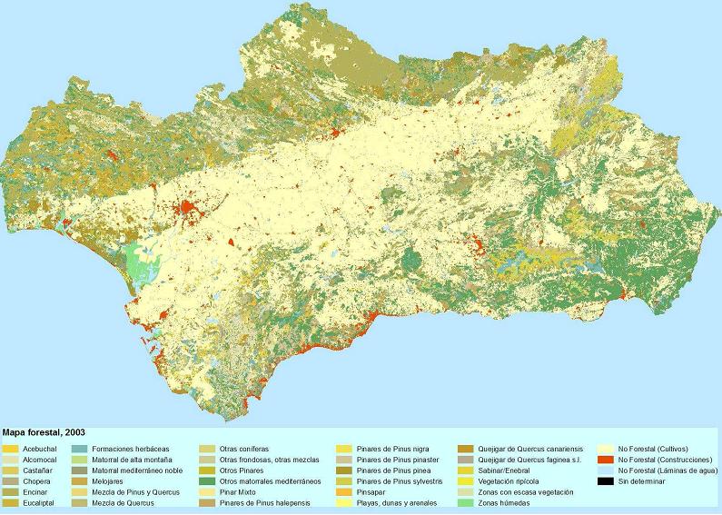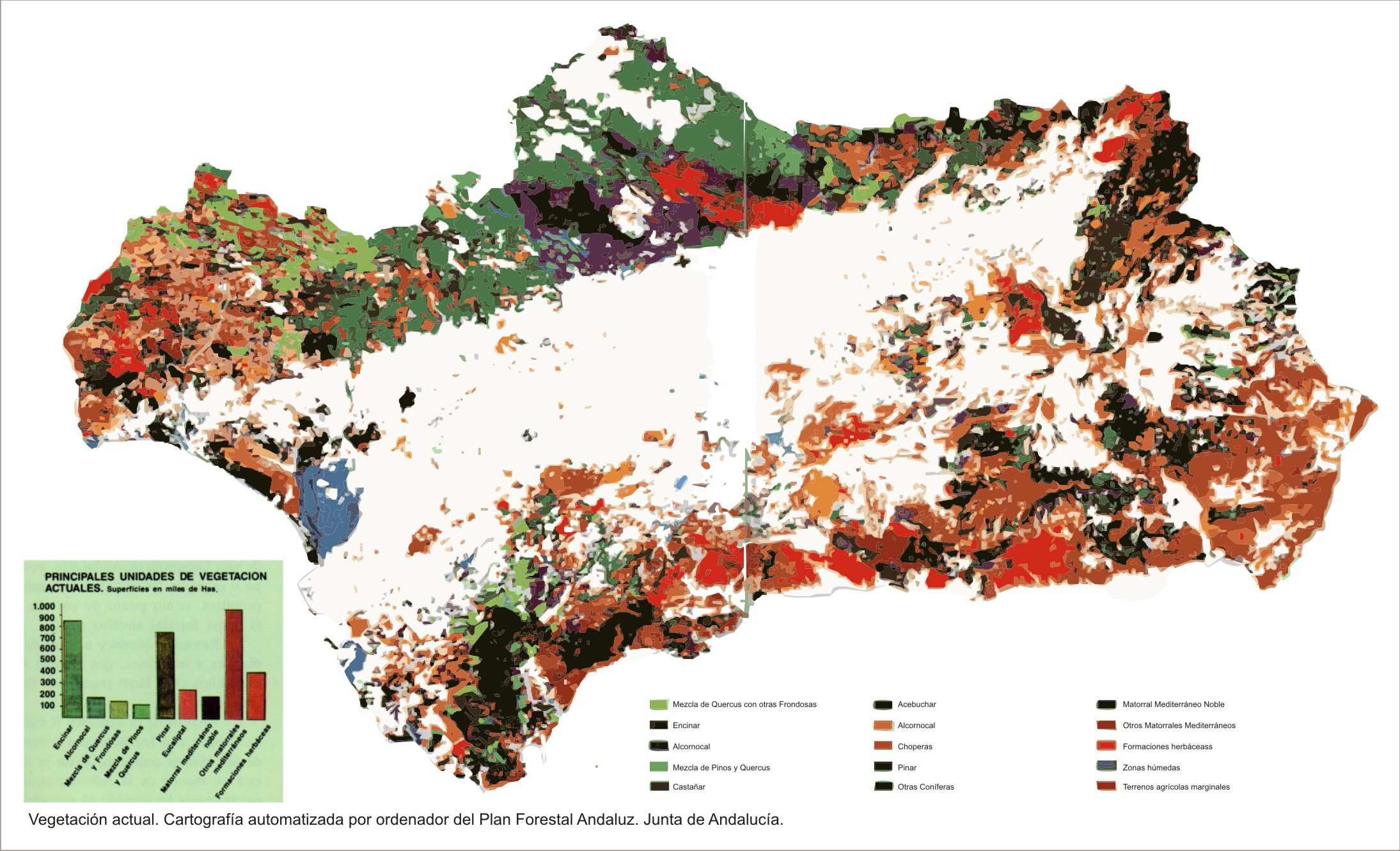 Distintas intervenciones humanas que han ido convirtiendo los paisajes potenciales e imaginariamente originales o climácicos de los bosques en Andalucía –anteriormente caracterizados-, en una serie de reales ecosistemas forestales que quedaron exhaustivamente recogidos en el Mapa de Unidades de Vegetación del Plan Forestal Andaluz (figura 3) y en su cuadro-resumen explicativo (cuadro 2).