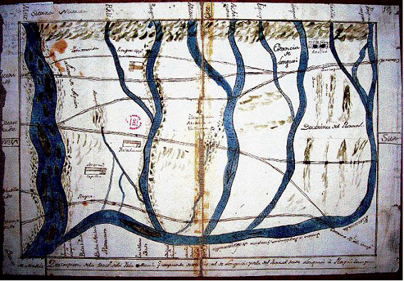 La importancia de los ríos o regiones fluviales se vio inicialmente expuesta en la posición de las pocas ciudades del siglo XVI en torno a la cuenca de cada río, como, por ejemplo, Santiago y Concepción. En pleno siglo XVI y XVII, el español se las ingenió para vadearlos, no sin sufrir los efectos del caudal de cada uno de ellos, como han expresado varios cronistas[3]. No en vano, durante gran parte de la llamada Colonia y posterior inicio de la nación, el medio principal de comunicación fue el mar, lo que colaboró a conformar un amplio territorio, constituido en partes diferentes según fuese su posición frente al río. Las figuras 1 y 2, fechadas prácticamente en los comienzos de la construcción de la nación, muestran un territorio “cortado” por los ríos, constituyendo áreas separadas entre un lado del río y otro. Ambas, a su vez, se presentan en sentido oeste-este valorizando el ya comentado sentido horizontal del territorio. Ellas representan un territorio múltiple y diverso. En este sentido, aspecto simbólico relevante, las figuran resaltan las cualidades sensibles y representacionales sobre el orden racional y objetivo del orden espacial.