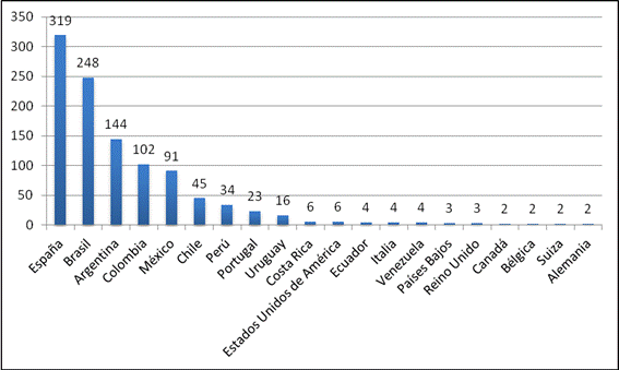 La revista continúa teniendo un marcado carácter internacional ya que los 188 autores que han colaborado con ella en 2012 provienen de 14 países distintos (Cuadro 2). Su procedencia es similar a la de otros años. Globalmente, existe un claro predominio de los españoles y brasileños: los primeros han firmado la mayor parte de los números corrientes y los segundos son mayoritarios en los números de carácter extraordinario. Entre los restantes países, cabe destacar las aportaciones argentinas, mexicanas y colombianas, que conjuntamente representan el 17,55 por ciento de las autorías.