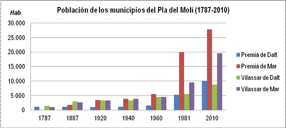 En los casos de los municipios de Premià de Mar y, especialmente, de Vilassar de Mar, las consecuencias territoriales y paisajísticas de la introducción del regadío han sido observadas a través del estudio de los usos del suelo mediante cartografía[47]. De dichos estudios se concluye que, del predominio de los cultivos de secano (cereal o viña combinada con cereal) a mediados del s. XIX, se pasa, cien años después, al dominio absoluto de la huerta. En la actualidad se ha producido una drástica reducción del espacio agrícola en favor de la superficie urbana. En Premià de Mar, la superficie agraria prácticamente ha desaparecido; en relación con Vilassar de Mar, los únicos espacios agrarios que quedan en el término municipal han pasado, en su mayoría, a estar cubiertos por invernaderos. La reducción de la tierra de cultivo en la comarca se aceleró a partir de la década de 1960, de forma paralela a la fase de expansión demográfica y urbanística. Es en esta etapa cuando los pueblos del litoral, que desde su origen hasta bien entrado el s. XIX habían sido solo modestas agrupaciones dependientes de los núcleos primitivos (situados en el interior), establecen las bases de su posterior consolidación como los centros más dinámicos y más populosos. Dos ejemplos notables de esta tendencia son los actuales núcleos de Vilassar de Mar y, en particular, Premià de Mar, que a finales del s. XVIII se habían segregado de sus respectivos núcleos matrices[48], y que, con la entrada del s. XX, se imponen –en términos demográficos– a las antiguas cabeceras municipales (figura 2).
