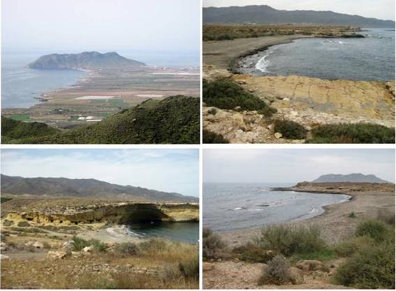 Geomorfológicamente, constituye una pequeña cuenca drenada por una decena de ramblas y barrancos que, prácticamente desde los piedemonte, han formado una sucesión de conos aluviales, de edad miocena, que se superponen unos con otros y que dan lugar a una red anastomosada, de amplios cauces de fondo plano entrelazados, en el que se hace difícil distinguir los que corresponden a cada rambla. Las redes de drenaje de las ramblas se instalan sobre un glacis elevado sobre el nivel marino actual, dando lugar, en algunas áreas, a una costa acantilada de entre 1 y 5 m (Figura 2), salpicada por un rosario de entrantes y pequeñas calas formadas por la desembocadura de los cauces que han excavado los depósitos miocenos.