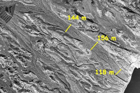 Con estos datos, y suponiendo que en la imagen de 1956 el mar se encontraba en bajamar y que el nivel máximo de marea en la zona puede estar en 10 cm, el retranqueo ocasionado por este efecto estaría entre los 0,8 m y los 1,6 m. En el caso más extremo en torno a la décima parte del retranqueo más bajo medido en Cala Blanca, de 15,8 m. Aún así, las sombras proyectadas por el frente acantilado suroeste de las calas sobre las playas en ambas imágenes, indican que estas se tomaron en las horas centrales del día, por lo que la diferencia de marea entre ambas, debe ser mínima. De igual modo sucede con la situación meteorológica, en ambas imágenes se aprecia un mar en calma, por lo que el posible efecto de la “marea meteorológica”, no ha tenido ninguna incidencia.