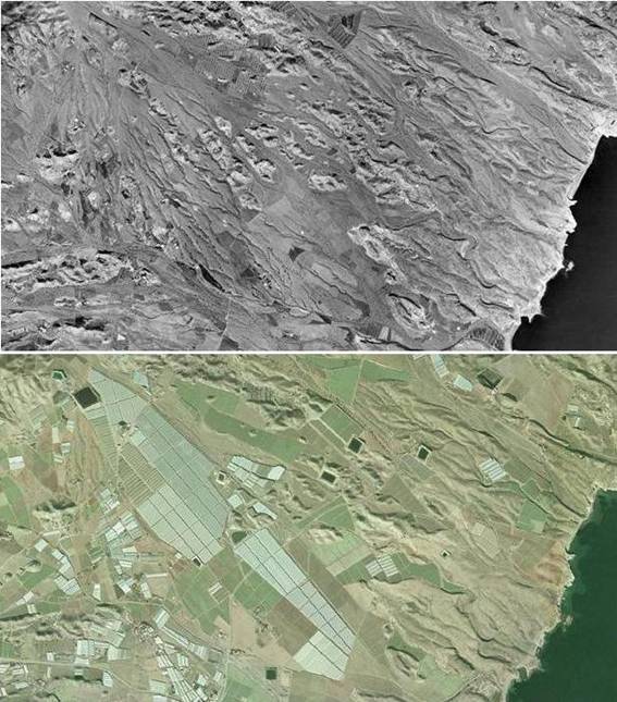 De estas 2.350 has cultivadas en la actualidad, casi 533 has, el 23%, corresponden a fondos de cauces no cultivados en 1956 y otras 1.000 has (42.5%) son roturaciones en laderas e interfluvios, que en 1956 estaban ocupados por matorrales y eriales.