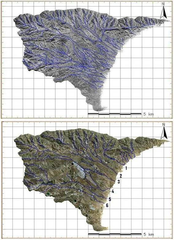 De la comparación de las imágenes de 1956 y 2007 es posible observar como, por un lado, ha desaparecido la configuración anastomosada de la red de drenaje que, desde los piedemonte hasta la desembocadura, en ocasiones, impedía distinguir con claridad entre unas ramblas y otras (Belmonte Serrato et al., 2011). En su lugar han quedado, perfectamente definidos, 6 cauces, correspondientes a sendas ramblas y otros cauces que se corresponden con pequeños barrancos en el sector noreste de la cuenca que permanecen sin alterar (Figura 5).