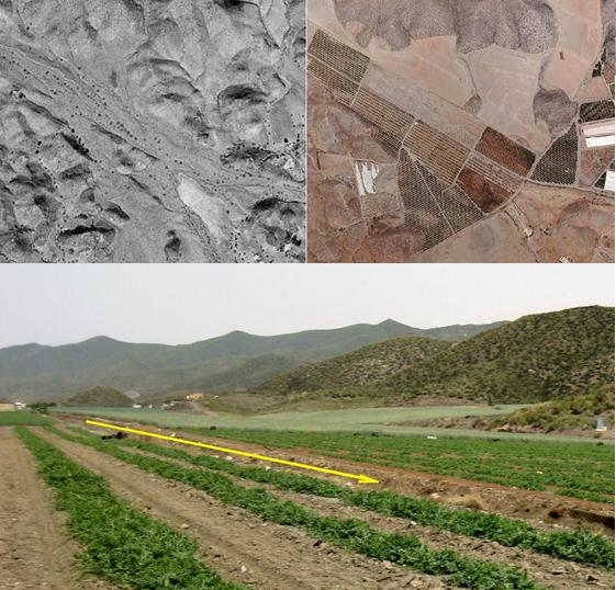 En este trabajo, se han comparado las ortoimágenes de 1956 y 2007, disponibles en Cartomur.com (CARM, 2009). Así mismo, se han utilizado los mapas topográficos a escala 1:25.000 (hoja 997B1, Calabardina). Con ellas se ha realizado un Modelo Digital del terreno (MDT) del área de estudio y se ha dibujado la red hidrográfica en 1956, a la que consideramos en estado “natural” y la correspondiente a 2007. Con posterioridad, mediante el programa GRASS, se han obtenido capas vectoriales, delimitando las superficies ocupadas por los cauces de crecida de las ramblas en 1956 y en 2007, mediante digitalización, para conocer la superficie perdida por ocupación agrícola. Con el mismo procedimiento, se han medido las superficies ocupadas por los cultivos en 1956 y en 2007 y aquellas que en esta última fecha están ocupadas por invernaderos, balsas de riego y reforestaciones, que no existían en 1956.