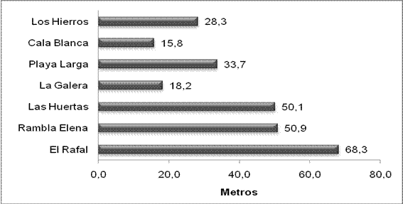 Dando por válidos estos valores, en la zona de estudio se habría producido un aumento del nivel del mar de unos 5 cm, de modo que teniendo en cuenta los datos de pendiente de playas, antes comentados, puede estimarse que como consecuencia de ese aumento del nivel marino, estas playas han experimentado un retranqueo hacia tierra de unos 4 m. En este caso, un 25% del retranqueo medido en Cala Blanca y sólo el 6% del retranqueo medido en la playa de El Rafal.