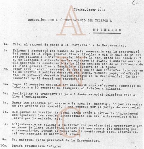 Key words: Commonwealth of Catalonia, public telephone network, rural telephony, telephone service.
