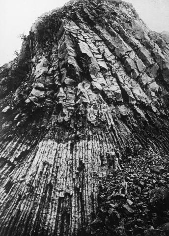 El basalto es una de las rocas efusivas, extrusivas, o volcánicas, expulsadas a la superficie de la tierra por la fuerza volcánica. Es una roca básica de color oscuro, pesada y resistente, generalmente de grano fino. Muy abundante en la corteza terrestre, está formada por el enfriamiento rápido del magma expulsado del manto por los volcanes. Por esta razón suele presentar vacuolas y cubrir extensas áreas. Se denominan columnatas basálticas o columnas basálticas, a los pilares más o menos verticales que se forman por el lento enfriamiento de lava líquida en las chimeneas volcánicas, o en las calderas que no llegan a desbordarse o vaciarse repentinamente. El enfriamiento sucede in situ y por lo tanto, más lentamente. Son pues características del basalto las masas con forma columnar almohadillada. Buehl (Bühl en alemán), antiguamente significaba colina y hoy aparece en la designación de muchos lugares geográficos de Alemania. La fotografía muestra unas colinas formadas por basalto, localizadas cerca de Weimar a 11 km al NO de Kassel. Las canteras de basalto explotadas tiempo atrás, hoy están abandonadas. Antes de la segunda guerra mundial, Weimar formaba parte de la provincia prusiana de Hessen-Nassau. En la actualidad Weimar es una ciudad del lander alemán de Turingia.