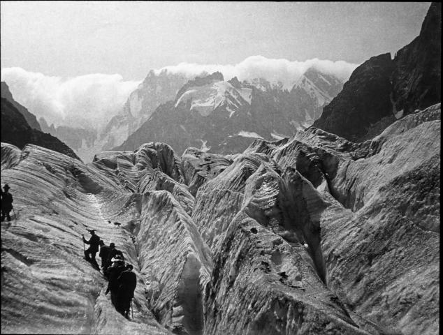 La Mer de Glace (Mar de Hielo), es un glaciar que se encuentra en la ladera N del macizo del Mont Blanc en los Alpes franceses, junto a Chamonix. Se encuentra a 2500 m de altura y está rodeado por otros glaciares como el de Lechaud, el de Cascade du Taléfre y el glaciar de Geant. Con una lengua de 7 km de largo y 200 m de profundidad, es el glaciar más importante de Francia. La Mer de Glace, como todos los glaciares, está constantemente renovado bajo el efecto de dos fenómenos: la acumulación debida a la nieve, y la ablación esencialmente debida al derretimiento. La Mer de Glace fluye permanentemente bajo el efecto de su propio peso, formando en la corteza grietas, (crevasses o seracs) dependiendo del tipo de terreno. La velocidad del glaciar aunque no es perceptible a simple vista, es considerable. Desciende más de 120 m al año en la parte superior y alrededor de 90 m al año en la región de Montenvers. La posición de su extremo frontal ha fluctuado a lo largo de los años y su máxima extensión fue a mediados del s. XIX. Con el avance del glaciar la masa de hielo se deforma, se rompe para adaptarse a la pendiente cuando ésta se vuelve acentuada. Entonces aparecen las grietas (crevasses). Estas son marcadamente transversales, es decir, se forman transversalmente a la dirección del avance. Cuando hay una intensa actividad de crevasses, la ruptura del glaciar por estas grietas forma bloques de seracs. Las Grandes Jorasses son un grupo de cimas graníticas que se encuentran en la parte septentrional del macizo del Mont Blanc, sobre la línea fronteriza entre Italia y Francia. Sobre la crestería, en una longitud de 1 km, se suceden seis cimas y cinco de ellas superan los 4.000 m.