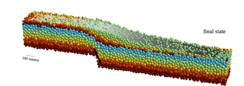 DEM modela, en 2D y 3D, la propagación y evolución dentro de un volumen de roca de la deformación causada por movimentos tectónicos y que afecten a los contornos rígidos del modelo, produciendo cabalgamientos, pliegues de propagación de falla, etc. Esta deformación es consecuencia de la interacción de muchos elementos individuales (los elementos discretos), de acuerdo a leyes mecánicas.