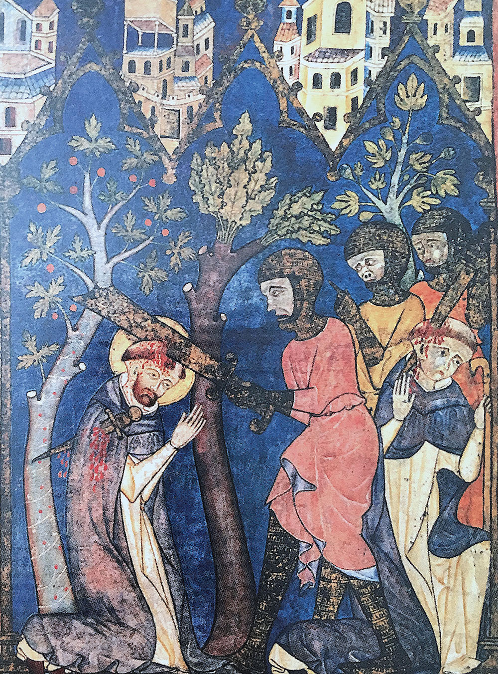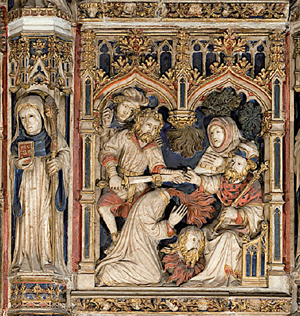 Les escenes dedicades a representar la mort per arma blanca de sants i santes configuren un grup molt extens que delimita sistemes d’execució que van més enllà de les decapitacions amb espasa o sabre. Encara que aquestes darreres es troben entre les formules més freqüents i poden documentar-se en l’art català del segles medievals entre els temes hagiogràfics recurrents, podem considerar variables que correspondrien, d’una banda, a les degollacions i execucions que no impliquen la pèrdua del cap immediatament, encara que s’hagi generalitzat el terme degollar també per a casos de decapitació tan paradigmàtica i directa com la de sant Joan Baptista (cat. 34). Tot i així es pot apreciar la diferència respecte degollacions com la patida per sant Cugat i pintada en un magnífic conjunt d’Aine Bru (MNAC) (cat. 133) o respecte de l’operació que advertim al frontal de santa Margarida de Vilaseca [2] que implica tallar el coll de la santa orant per davant mentre el botxí l’agafa dels cabells, sense que hi hagi certesa sobre la profunditat del tall. D’altra banda, en la pintura catalana també descobrim sistemes de decapitació alternatius que venen a prefigurar les guillotines modernes (cat. 131).