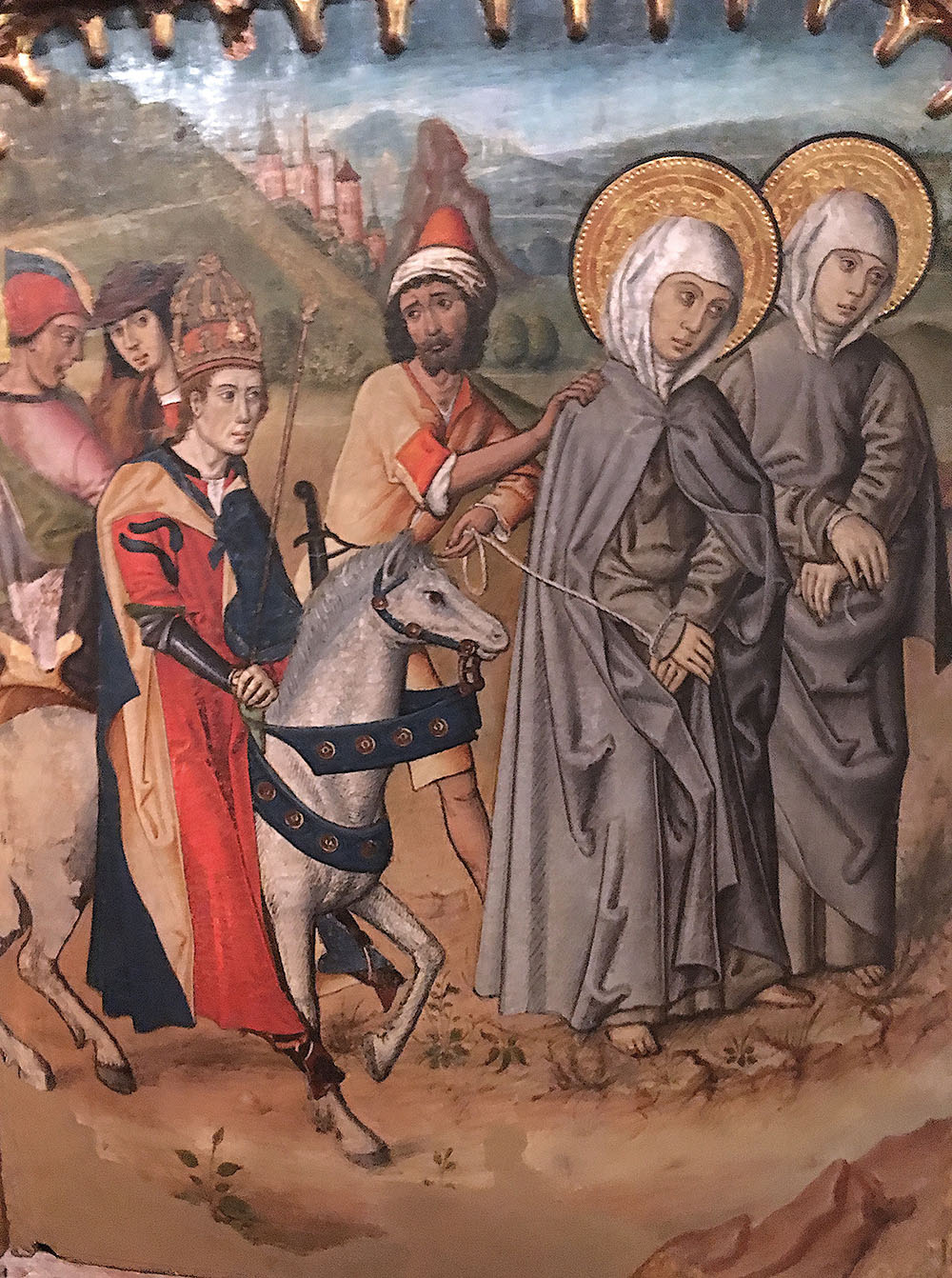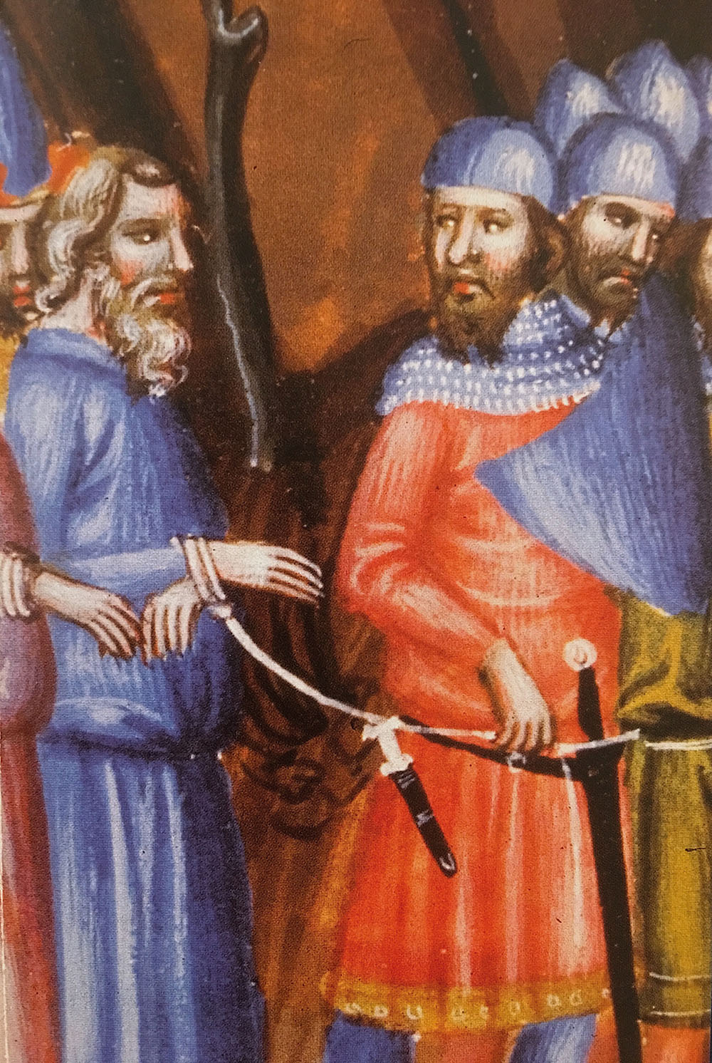 El bes de Judes corona de manera singular l’arrest de Crist que inaugura un dilatat procés que se li gira en contra, ja envoltat pels soldats romans que s’encarreguen de custodiar-lo i traslladar-lo d’audiència en audiència (cat. 94-96). En les històries de molts sants i santes no hi ha cap bes, però el relat inicial és semblant i detectem, com en el frontal romànic de Santa Margarida de Vilaseca, un espai exterior propici per a que una parella d’armats, identificat com a miles, detinguin la pastora, una jove donzella que s’enfronta a Olibri i no claudica mai davant dels seus desigs [1]. Aquest “prendiment” inicial inaugura un seguit de recorreguts que seguiran i en els quals el braç armat de la justícia continua delimitant el seu lloc. El tràfic amb els presoners ens porta a recuperar una altra nimbada que és empesa per un home de rostre gran i exagerat, vist de perfil, als murals de santa Caterina de la Seu d’Urgell [2]. Una obra pictòrica interessant que considero deutora dels esquemes del Mestre que treballa als murals de sant Esteve d’Andorra la Vella (cat. 12). Aquí les figures se sobreposen lliurement i tenen consistència encara que sovint floten en un espai de delimitació incerta. El seu caire abstracte permet, tot i la component gòtica del relat visual, no avançar-ne molt la cronologia dins del segle xiii. L’expressió general, la boca entreoberta i la posició del cos del soldat delaten una agressivitat o violència innecessària davant d’una santa que, vestida ricament, no genera gaire oposició. Una actitud dòcil que, com a molt, deriva en un discurs del sant davant del seu opositor o, a manera…