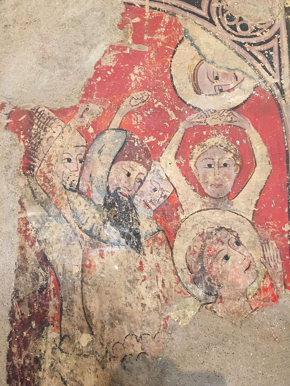 En les pintures romàniques de Sant Joan de Boí la lapidació posa l’accent en la caiguda dels rocs blanquinosos distribuïts a manera de pedregada damnosa que parteix de les mans dels tres botxins dinàmics, visionats de perfil, a diferència del sant, que mostra un rostre de tres quarts amb les pedres en equilibri sobre al cap i singulars ferides sagnants al front [1]. A Boí sant Esteve havia d’aparèixer ajupit o agenollat, com en altres ocasions, amb la testa alta que mira sempre al cel, tant a la pintura romànica com a la gòtica [1-3]. En la…