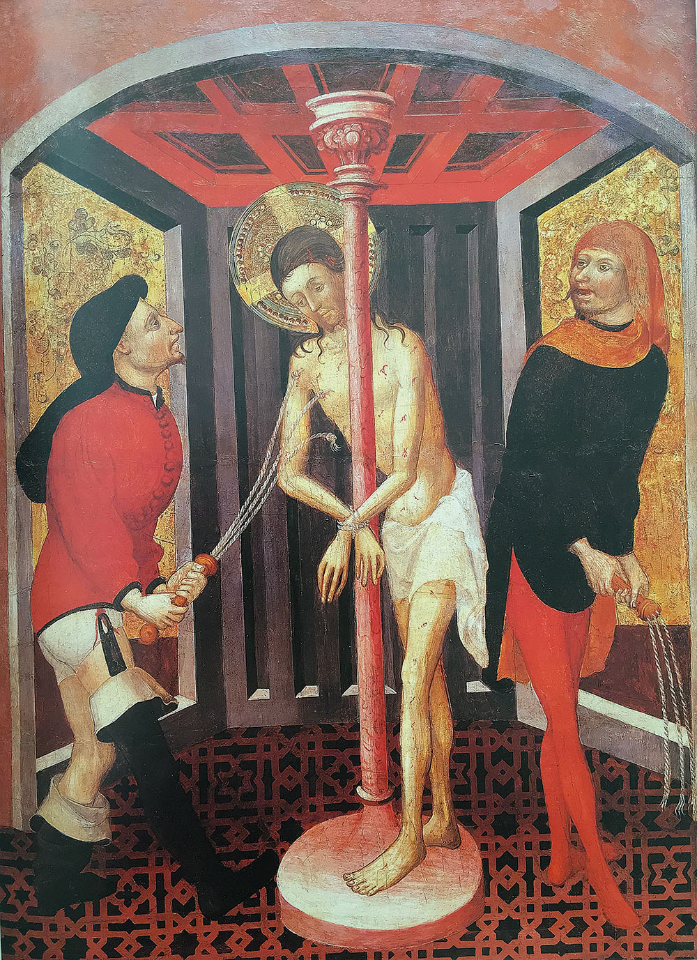 Els tres casos de flagel·lació que presentem segueixen l’esquema més reiterat en la pintura catalana medieval: Crist és abraçat a la columna de manera que el veurem darrere del suport amb les mans lligades pel davant. Ramon de Mur, a la predel·la del retaule de Guimerà (MEV), aporta una excepció interessant en pintar la víctima al primer terme. És una escena malmesa que cal valorar amb molta atenció ja que sembla remetre als preparatius del martiri més que no pas a l’acte de flagel·lació, tenint en compte que el cos de Jesús no mostra cap ferida evident. És freqüent que la imatge del penat se situï tal i com la veiem en les obres catalanes del segle xv que reproduïm [1-3] fins arribar pràcticament al final de l’Edat Mitjana quan el reu passa a ocupar la part davantera fent possible la visió neta del cos, sigui amarrat a la columna per un o diversos punts. Recordem que el canvi s’instaura ja al retaule de sants Justs i Pastor de Son i en les més espectaculars solucions que es generen al llarg del segle xvi (cat.108), però ja havia estat adoptat en obres gòtiques de forma contundent, com demostren les Molt Riques Hores del Duc de Berry. En les versions medievals la columna pren entitat pròpia i obliga a plantejar el seu protagonisme i el vincle realista o especulatiu amb l’arquitectura que l’emmarca. El disseny i material del suport són també factors apreciables. En les pintures de Joan Mates o Francesc Borrassà (?) [1-2] destaca la coloració rosada que fa pensar en un material preuat, granític o marmori, que remet a eleccions ja visibles almenys des del segle…