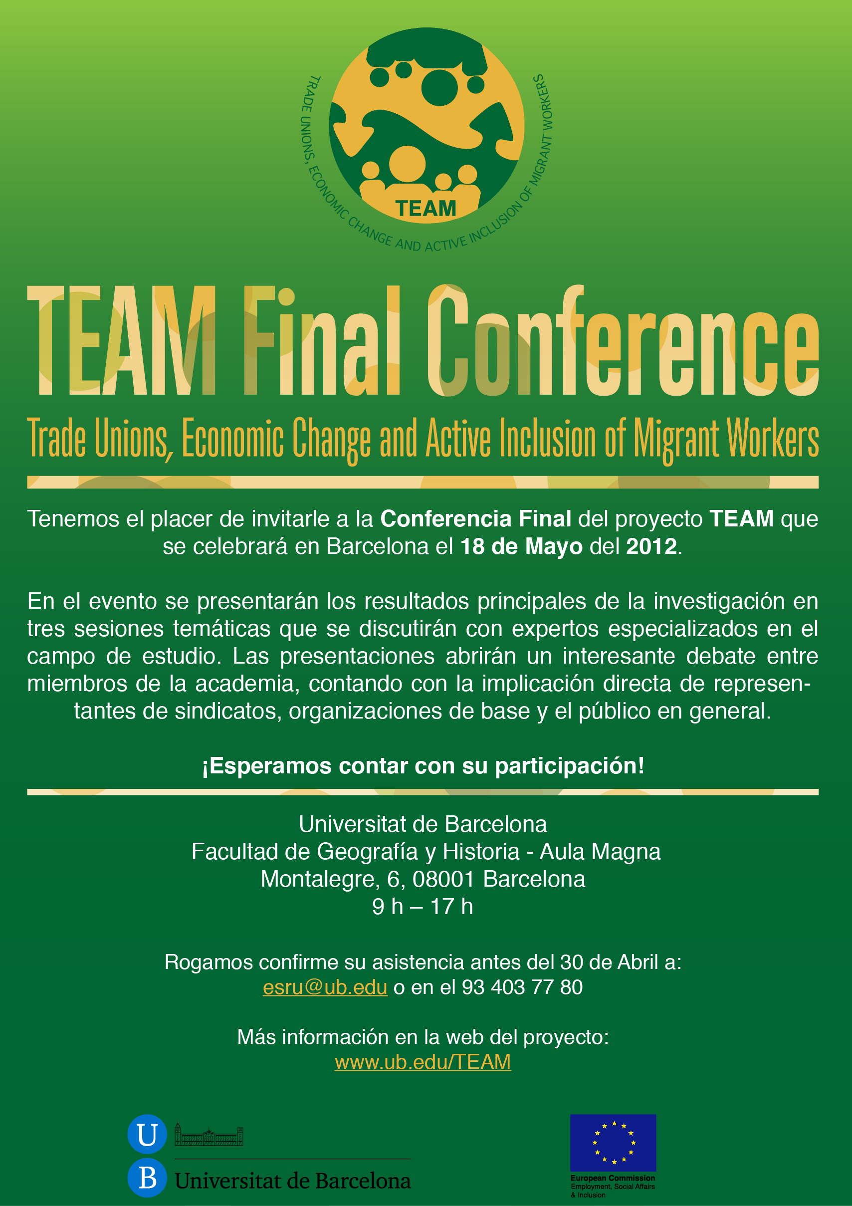 En la Conferencia Final del proyecto TEAM se presentarán los resultados principales de la investigación en tres sesiones temáticas que se discutirán con expertos en el campo de estudio. Las presentaciones abrirán un intersante debate entre miembros de la academia, contando con la implicación directa de representates de sindicatos, organizaciones de base y el público en general.
