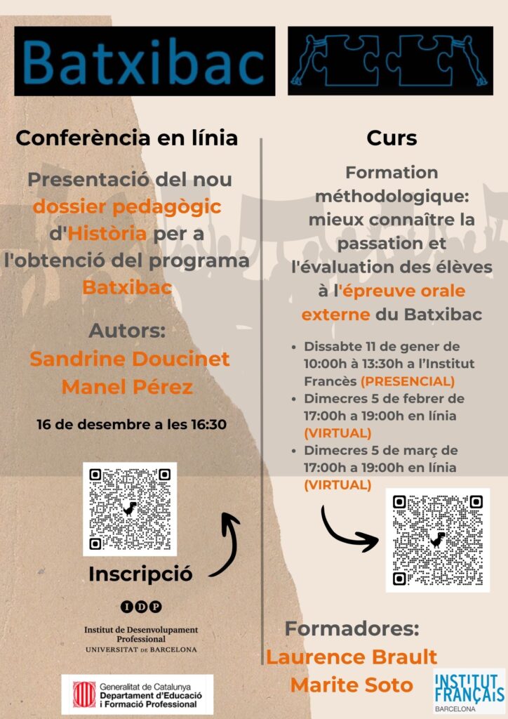 Per últim, recordar-vos que tenim oberta la inscripció del curs Formation méthodologique: mieux connaître la passation et l’évaluation des élèves à l’épreuve orale externe du Batxibac organitzat amb el Departament i l’Institut Francès de Barcelona.