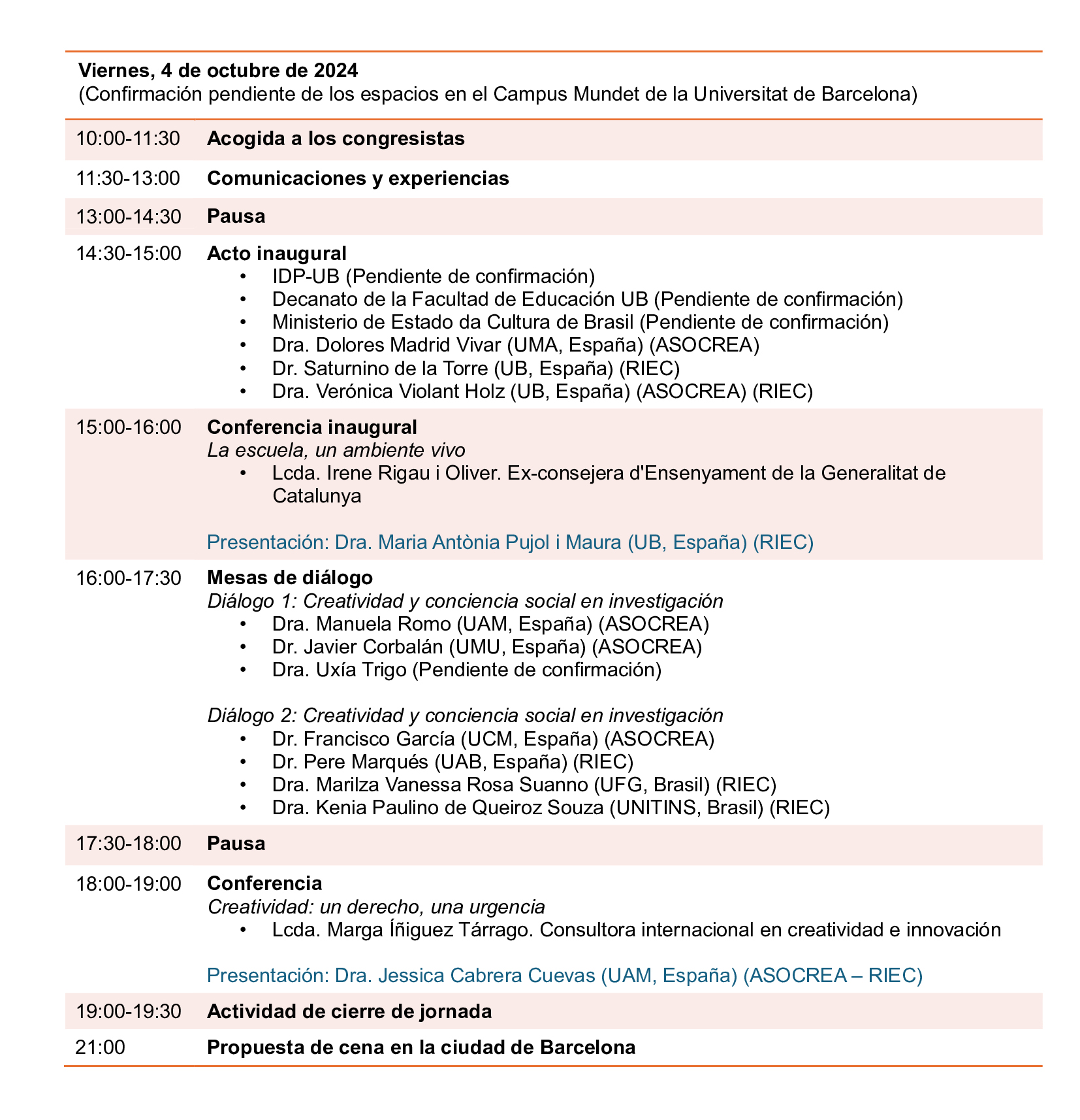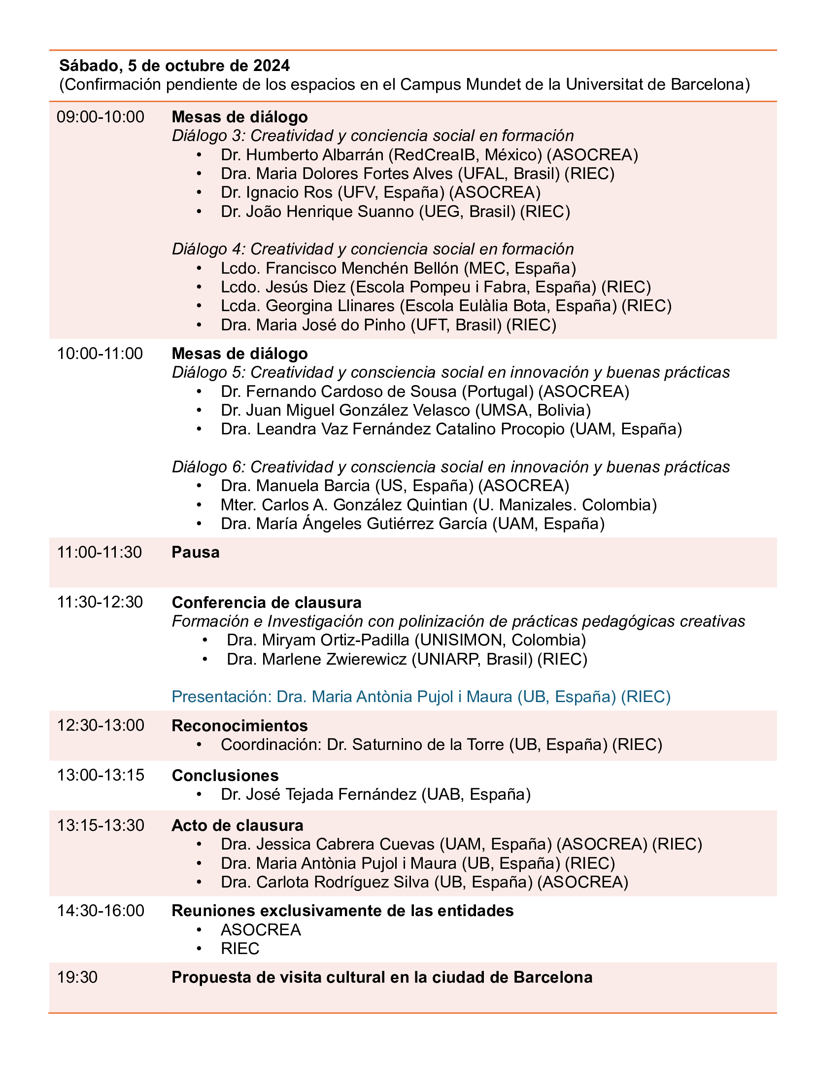 La Red internacional de Escuelas creativas (RIEC) surge como necesidad de trascender la creatividad personal para poner el foco en las instituciones innovadoras con mayor potencial de continuidad y polinización de una educación transformadora. La red tiene una intensa actividad educativa desde su formalización en 2012, siendo reconocida como Asociación de Escuelas Creativas (ADEC) por el Ministerio del Interior de España en 2018. Cuenta con más de 15 núcleos en varios países, habiendo arraigado de forma especial en Brasil, en los que se trabaja en formación, investigación y extensión teniendo como referente la creatividad. Lleva organizados 11 Fórums INCREA internacionales; 6 Jornadas internacionales; más de 25 reconocimientos a personas e instituciones, más de 90 investigaciones vinculadas a RIEC; más de 80 libros; más de 230 capítulos de libro; más de 350 artículos; más de 80 tesis de maestría y doctorado dirigidas; más de 200 conferencias en congresos. Ha llevado a cabo numerosas experiencias educativas y transformaciones de centros. La aportación de RIEC/ADEC a las Jornadas es la toma de conciencia sobre la necesidad de incorporar la creatividad en las reflexiones pedagógicas, los proyectos de centro y las prácticas educativas. La sociedad está cambiando y la educación ha de cambiar su sistema de enseñanza. No se puede seguir enseñando con métodos de ayer a alumnos que ya viven en el mañana. Ese es un reto por afrontar. Investigación, reflexión y acción subyacen en las experiencias creativas de los centros educativos. La creatividad ha de ser un valor que promover institucionalmente, una estrategia docente y un instrumento de transformación social. Así mismo poner el foco en la importancia del desarrollo de una conciencia ambiental, social y espiritual que de luz a esa educación de calidad acorde con los tiempos actuales.