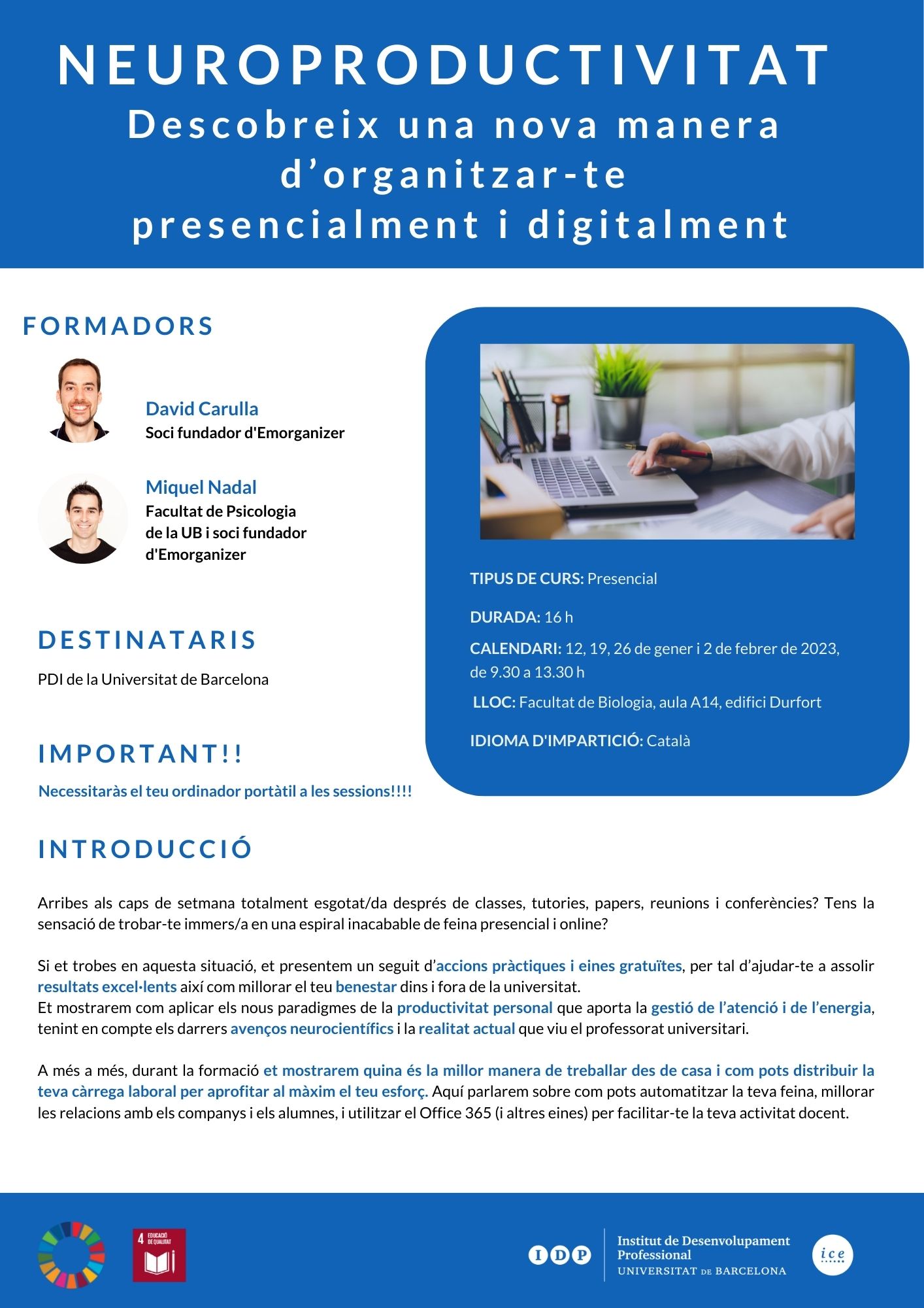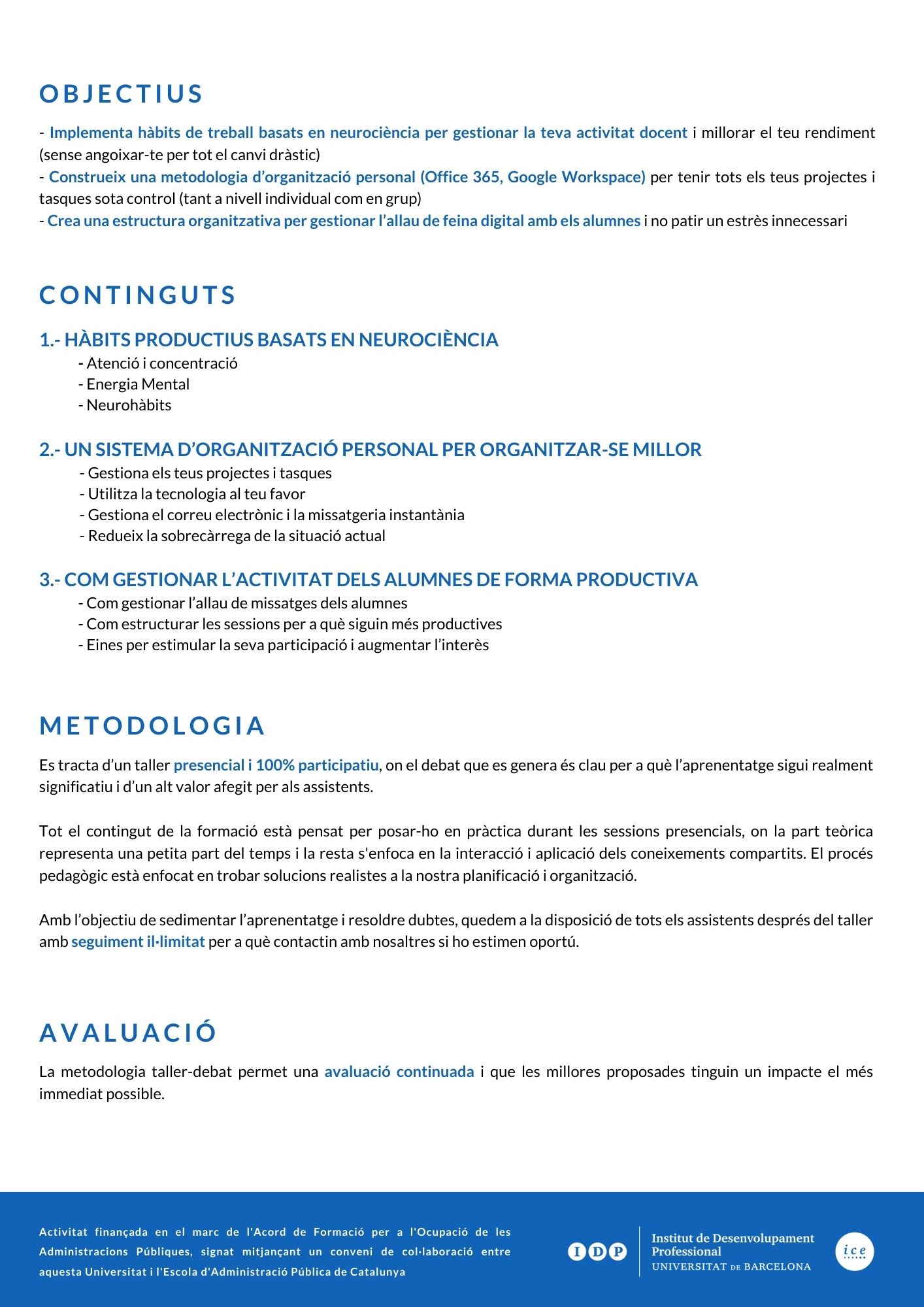 Neuroproductivitat: descobreix una nova manera d’organitzar-te presencialment i digitalment Compartir: Estat matrícula Matrícula tancada