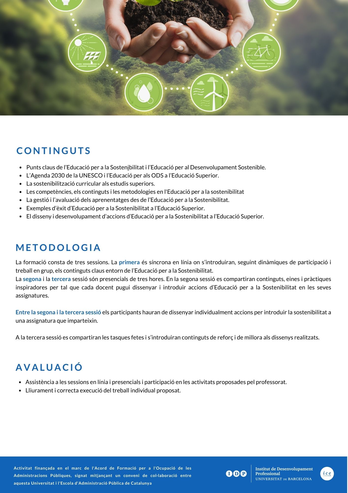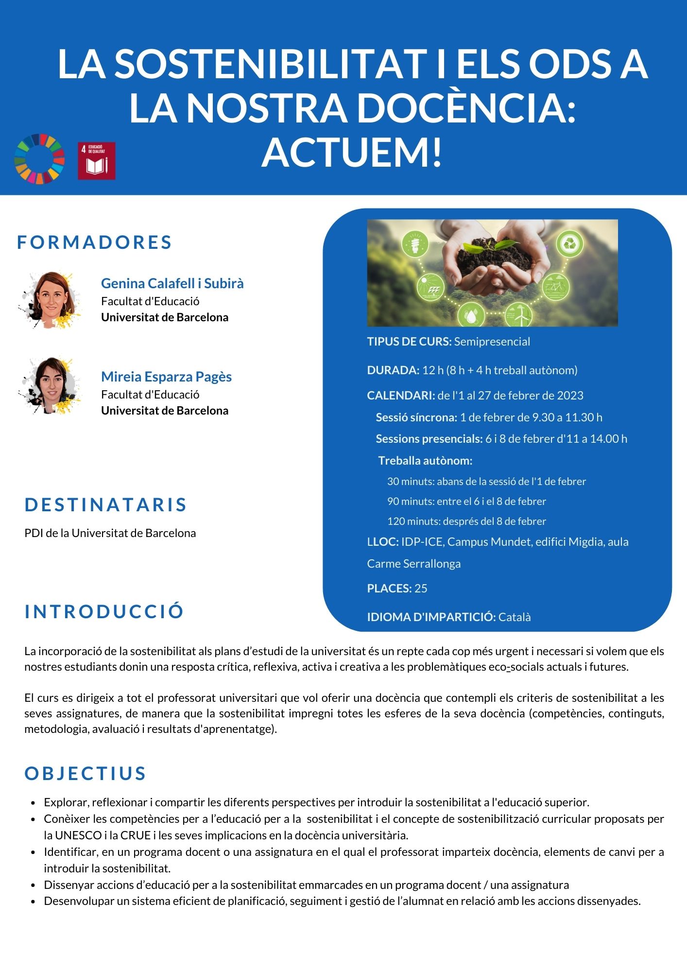 La Sostenibilitat i els ODS a la nostra docència: Actuem! Compartir: Estat matrícula Matrícula tancada