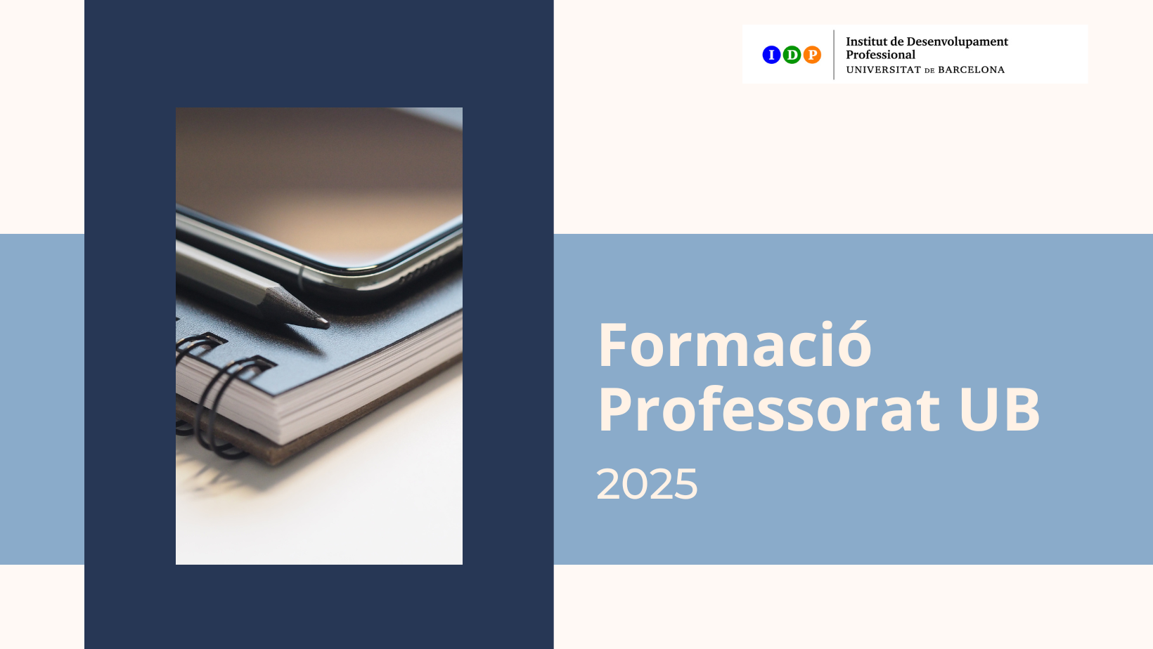 Aquí podreu trobar les activitats formatives previstes per l'any 2025 ordenades per programes: Formació en docència, Formació en recerca i Formació en gestió. Aquesta programació s'anirà actualitzant. ANUL·LACIÓ DE LA MATRÍCULA: en cas de no poder assistir a una activitat formativa, us preguem que ens ho comuniqueu, a l'adreça idp.formub@ub.edu, amb un mínim de 72 hores d'antelació, amb la finalitat de facilitar la vostra plaça a una altra persona. La no comunicació suposarà que a la pròxima edició de cursos només es podrà optar a activitats amb places vacants. CERTIFICAT D'ASSISTÈNCIA: per obtenir-lo cal assistir a les sessions programades i dur a terme les activitats proposades pels formadors. No se certificarà a les persones que no hagin estat acceptades prèviament a les activitats. |