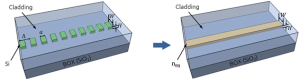 Fig. 1: Three-dimensional schematic of a silicon SWG waveguide surrounded by a buried oxide (BOX) layer and a SiO2 upper cladding and the equivalent metamaterial defined by and equivalent refractive index (n_eq).