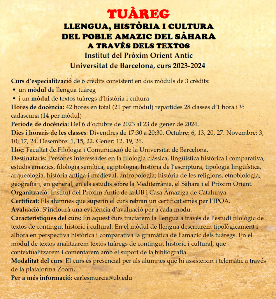 L’Institut Universitari del Pròxim Antic de la Universitat de Barcelona (IPOA), en col·laboració amb la Casa Amaziga de Catalunya, ofereix aquest curs d’especialització de 6 crèdits durant el curs 2023-2024. Aquí podeu trobar informació sobre el curs i l’imprès de matrícula. La matrícula comença el dia 1 de setembre i cal formalitzar-la abans del 5 d’octubre.