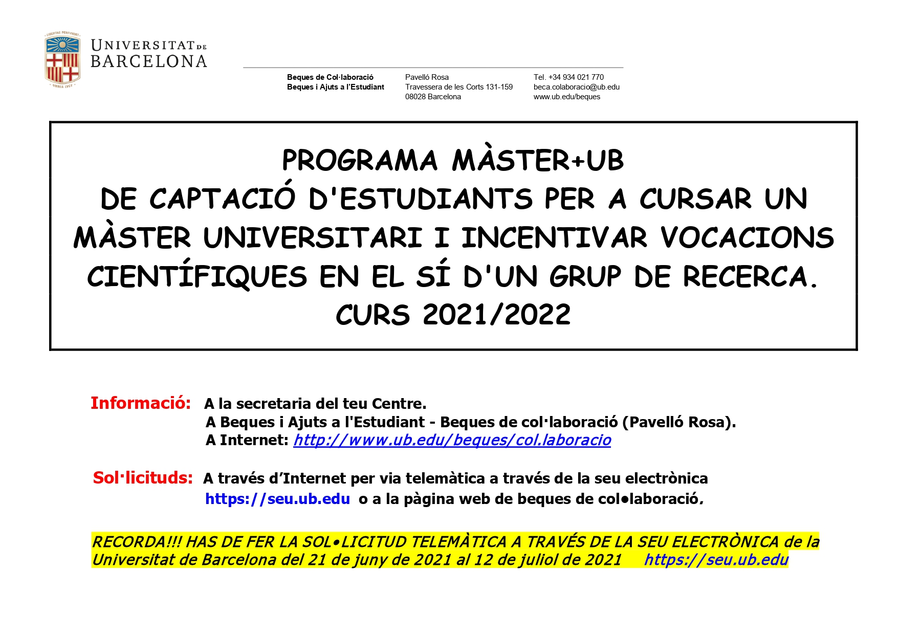 Programa Màster+ UB de captació d’estudiants per a cursar un màster universitari i incentivar vocacions científiques en el sí d’un grup de recerca. Curs 2021/2022 (CODI 2021.2)
