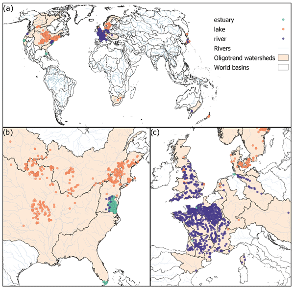 El mapa mostra la distribució de les estacions de mostreig incloses a OLIGOTREND. La base de dades cobreix 33 grans conques hidrogràfiques i una àmplia varietat de contextos climàtics i ambientals, des de zones boreals fins a regions mediterrànies i tropicals.
