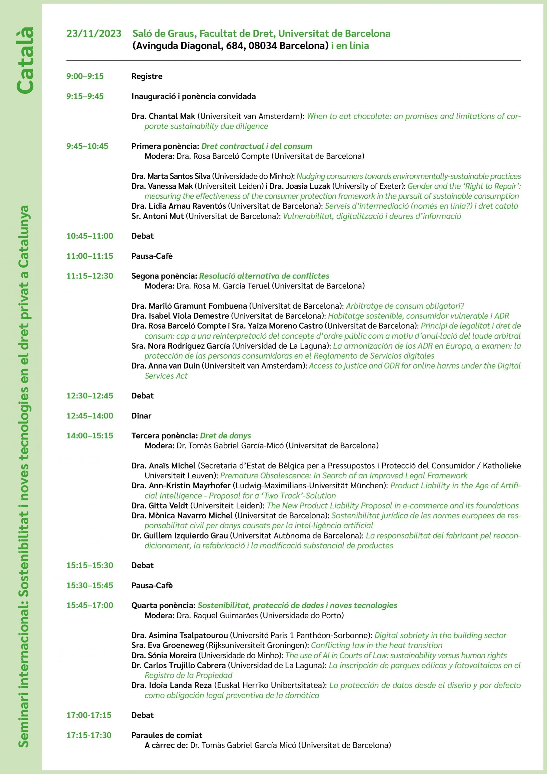 Seminari internacional, Sostenibilitat i noves tecnologies en el dret privat a Catalunya. Data: 23 de novembre de 2023. Horari: 9:00-17:30 h. Lloc: Universitat de Barcelona. Facultat de Dret. Saló de Graus.