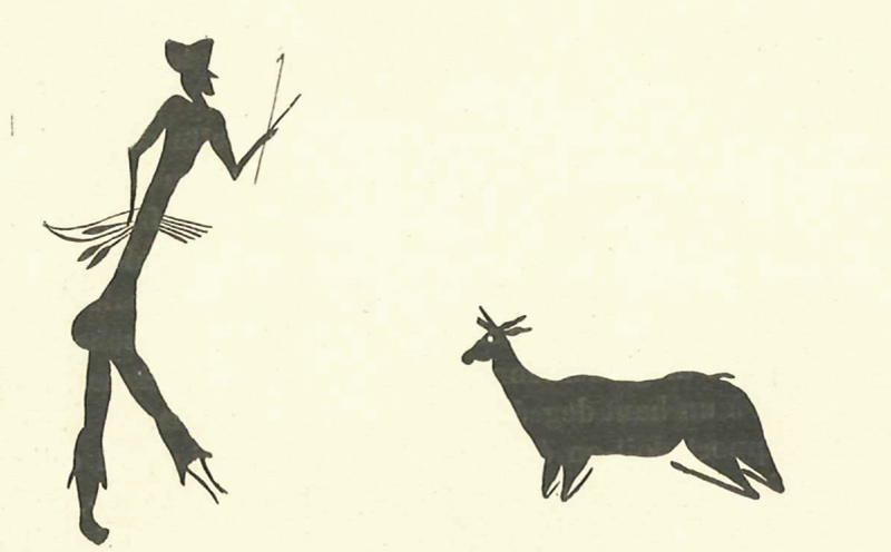 The outstanding figure is a large, naturalistic archer, well characterised with a trapezoid headdress and facial details, marked buttocks and trousers tight at the calf. He is armed with a bow and a bundle of arrows, from which he is extracting one to prepare his shot. Next to him are the remains of six naturalistic deer distributed along the entire length of the frieze.
