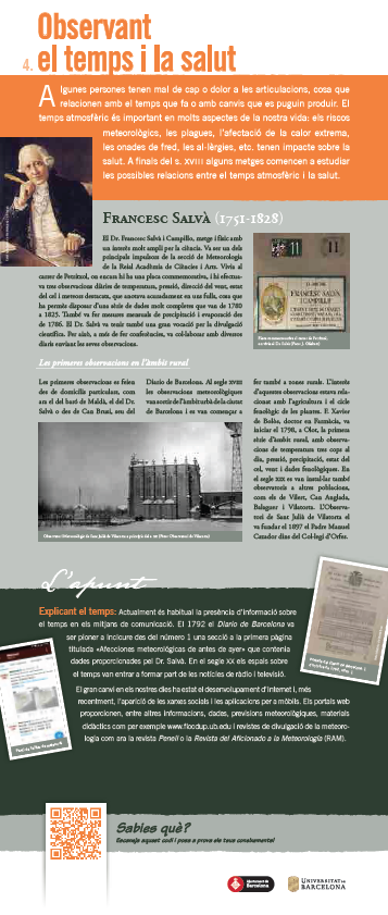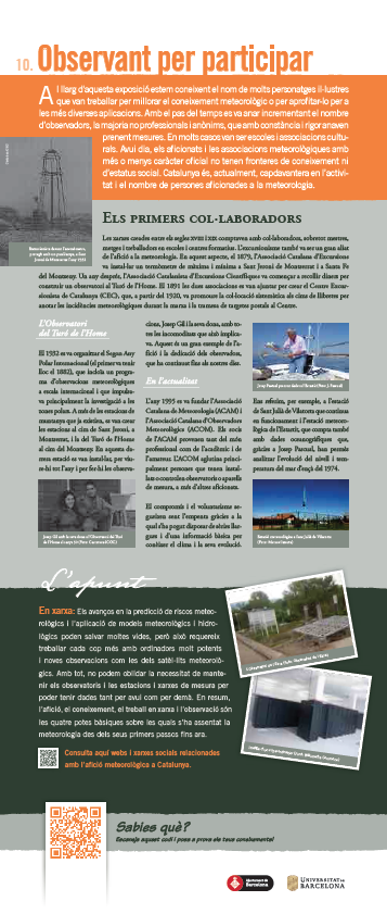 En aquesta exposició us convidem a fer un recorregut per aquest interès per la meteorologia a Catalunya. A través de disset plafons, us mostrarem com i què s’observava en el passat i quins avenços s’han fet. També hi aprendrem conceptes bàsics de la meteorologia, la climatologia i el canvi climàtic, així com altres aspectes menys coneguts. A més, cada plafó inclou un codi QR a través del qual es pot accedir a una proposta didàctica.