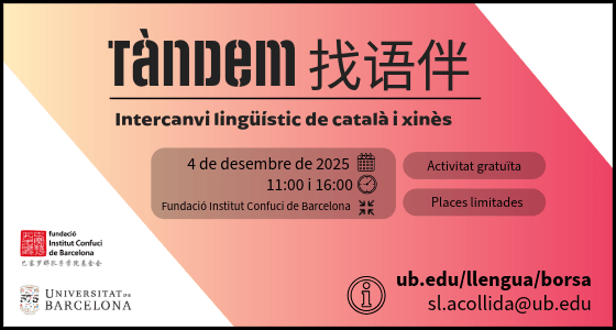 El xinès no és pas una llengua nova (ni d’un bon tros!) a la Borsa, però sí que és una llengua a l’alça: d’una banda, els estudiants xinesos cada cop accedeixen més als cursos de català i, per tant, també a les activitats que oferim per practicar la llengua; de l’altra, hi ha un interès creixent per la llengua i la cultura xineses entre els locals. I això, a la UB, és clar, es nota: cursos de llengua xinesa a l’EIM, celebració de l’Any Nou a la Facultat d’Educació, assignatura de xinès per als negocis a la Facultat d’Economia, art contemporani xinès a la de Belles Arts, etc.