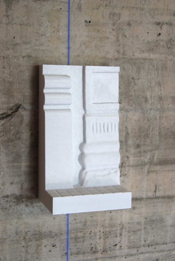 La obra se compone por una línea marcada en azulete sobre un muro de hormigón, a la manera como lo hacen los albañiles para marcar una pared; esta línea está flanqueada por unas baldosas de cerámica que indican la numeración de dos edificios contiguos y reproduce a escala fielmente, mediante técnicas de captación y impresión 3d, el encuentro de las molduras de los zócalos de los dos edificios en este punto.