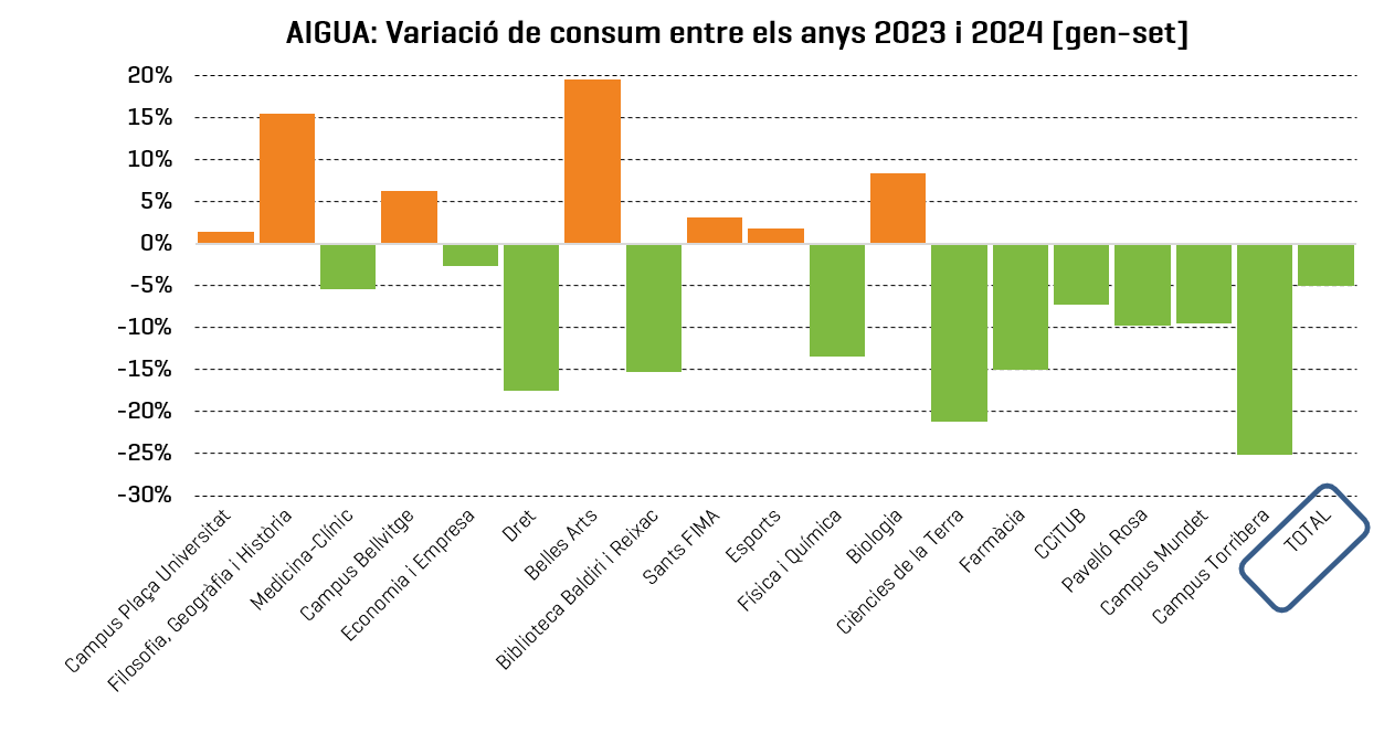 Pel que fa a l’evolució del consum d’aigua per centres, s’ha assolit una major reducció al Campus de l’Alimentació de Torribera (-25,1 %), a la Facultat de Ciències de la Terra (-21,2 %), a la Facultat de Dret (-17,6 %) i a l’edifici Baldiri Reixac (-15,2 %). En canvi, ha augmentat significativament a la Facultat de Belles Arts (+19,5 %) i a les facultats de Filosofia i de Geografia i Història (+15,5 %), a causa de dues fuites que es van produir durant el primer semestre i que van ser reparades i, en proporció més baixa, a la Facultat de Biologia (+8,4 %).