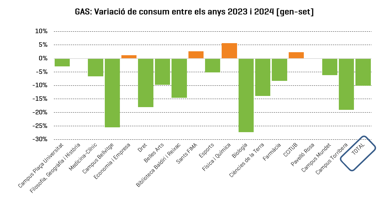 El consum de gas no presenta gaires variacions respecte als valors mostrats per al primer semestre, donat que els mesos d’estiu se’n consumeix una quantitat molt petita. La reducció és generalitzada en gairebé tots els centres, amb una disminució superior al 15 % a la Facultat de Biologia (-27,3 %), al Campus Bellvitge (-25,5 %), al Campus de l’Alimentació de Torribera (-19,0 %) i a la Facultat de Dret (-18,1 %). L’increment més rellevant es produeix a les facultats de Física i de Química (+5,7 %).
