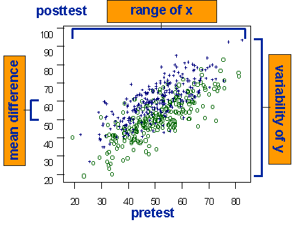 So how does blocking work to reduce noise in the data? To see how it works, you have to begin by thinking about the non-blocked study. The figure shows the pretest-posttest distribution for a hypothetical pre-post randomized experimental design. We use the 'X' symbol to indicate a program group case and the 'O' symbol for a comparison group member. You can see that for any specific pretest value, the program group tends to outscore the comparison group by about 10 points on the posttest. That is, there is about a 10-point posttest mean difference. Now, let's consider an example where we divide the sample into three relatively homogeneous blocks. To see what happens graphically, we'll use the pretest measure to block. This will assure that the groups are very homogeneous. Let's look at what is happening within the third block. Notice that the mean difference is still the same as it was for the entire sample -- about 10 points within each block. But also notice that the variability of the posttest is much less than it was for the entire sample. Remember that the treatment effect estimate is a signal-to-noise ratio. The signal in this case is the mean difference. The noise is the variability. The two figures show that we haven't changed the signal in moving to blocking -- there is still about a 10-point posttest difference. But, we have changed the noise -- the variability on the posttest is much smaller within each block that it is for the entire sample. So, the treatment effect will have less noise for the same signal. It should be clear from the graphs that the blocking design in this case will yield the stronger treatment effect. But this is true only because we did a good job assuring that the blocks were homogeneous. If the blocks weren't homogeneous -- their variability was as large as the entire sample's -- we would actually get worse estimates than in the simple randomized experimental case.