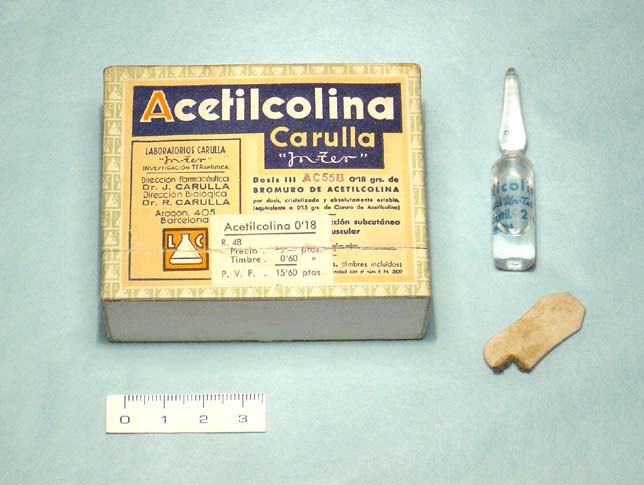 Capsa de cartró. 6 ampul·les de 2 c.c. d'aigua bidestil·lada. 6 ampul·les de 0,18 g d'acetilcolina cristal·litzada.