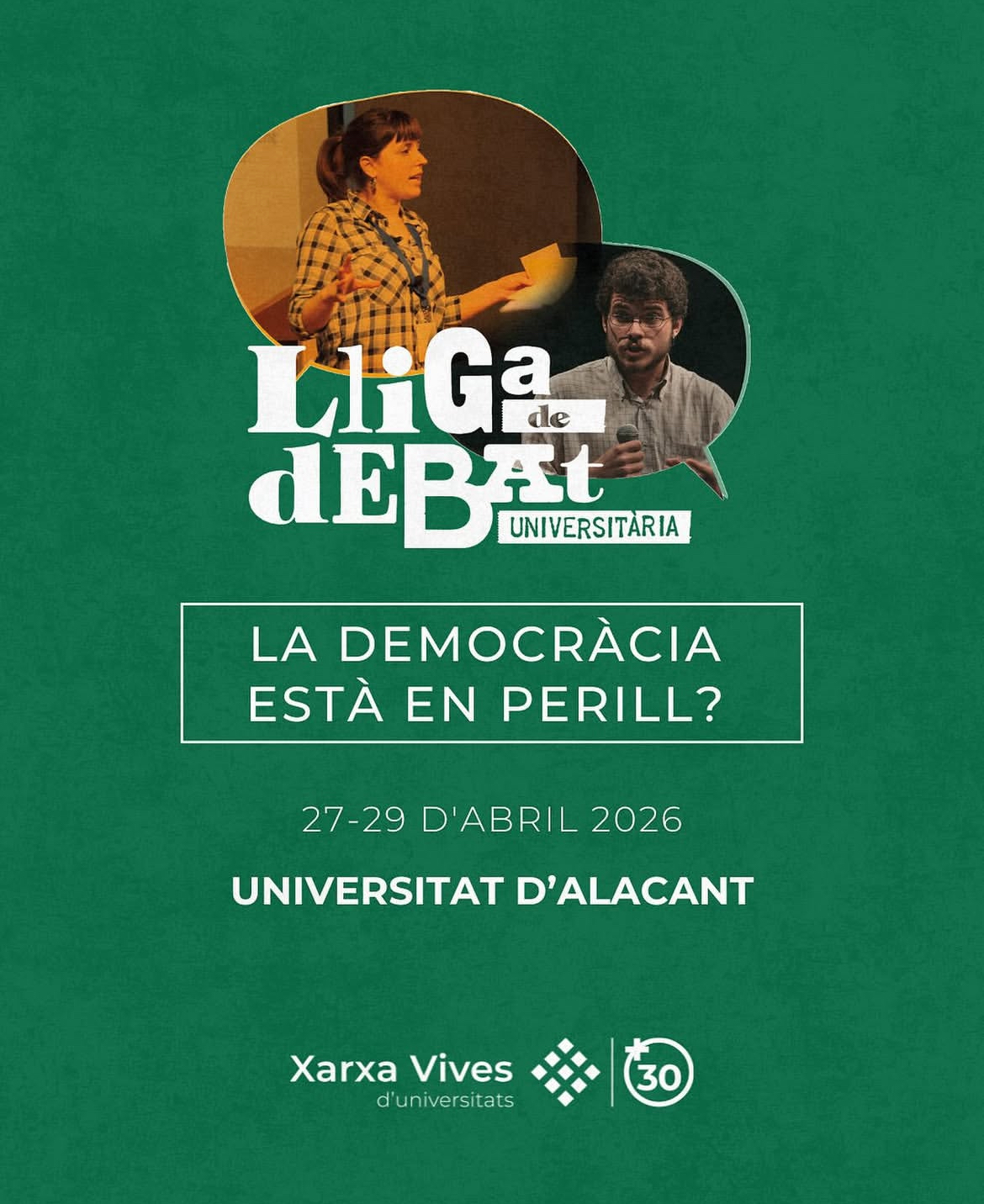 Arriba una nova edició de La lliga de Debat Universitària amb el tema: “La democràcia està en perill?”, que tindrà lloc de manera presencial del 27 al 29 d’abril de 2026 a la Universitat d’Alacant.