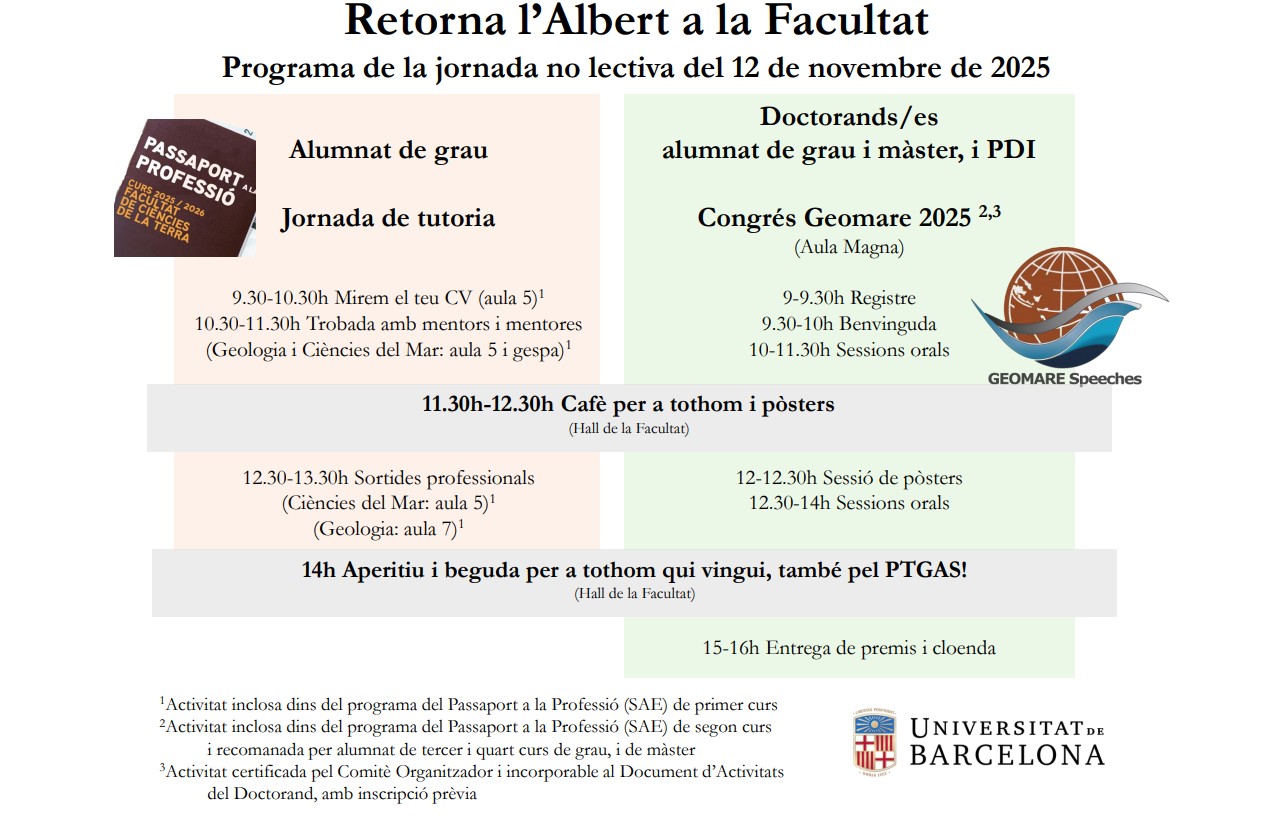 A les 11:30, tots els col·lectius (alumnat, professorat i també el PTGAS), està convidat al coffee break del congrés "Geomare 2025" juntament amb l’exposició de pòsters, i a les 14:00 la facultat convidarà a un petit aperitiu a tothom qui vingui al vestíbul.