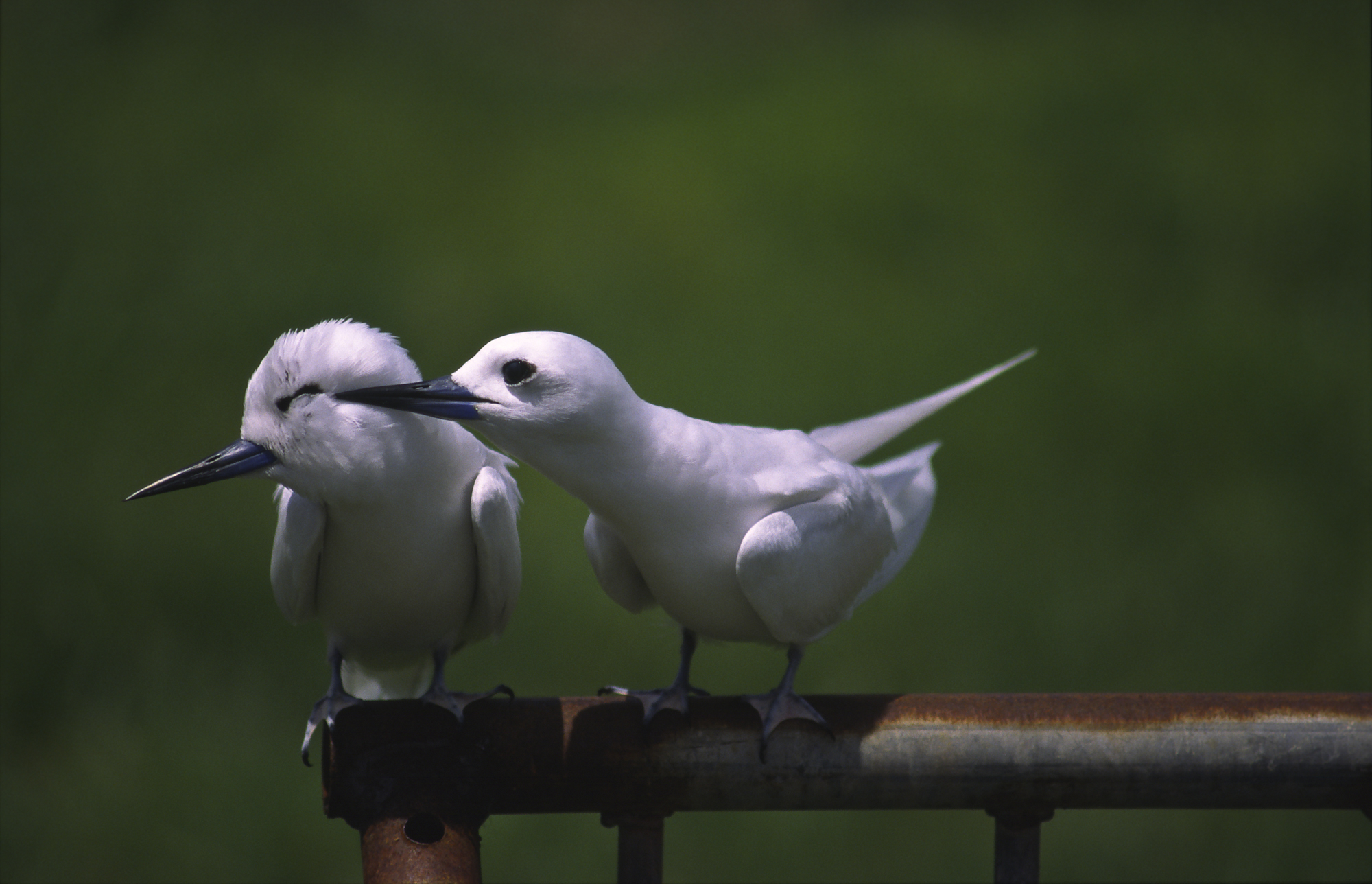 "Una parella de xatracs blancs (Gygis alba) festejant. L’illa és tristament coneguda per la batalla de Midway del 4 al 7 de juny de 1942, quan les forces armades dels Estats Units van colpejar amb força la flota aeronaval japonesa. Sortosament, Midway (a mig camí entre Amèrica i Àsia) és avui en dia un santuari de fauna, ple d'ocells marins, foques i tortugues. A l’illa encara queden unes 120 edificacions, la majoria restes de l'antiga base militar. Els xatracs blancs aprofiten qualsevol estructura per descansar o per posar-hi el seu únic ou, de vegades aconseguint un estat d'equilibri inversemblant."