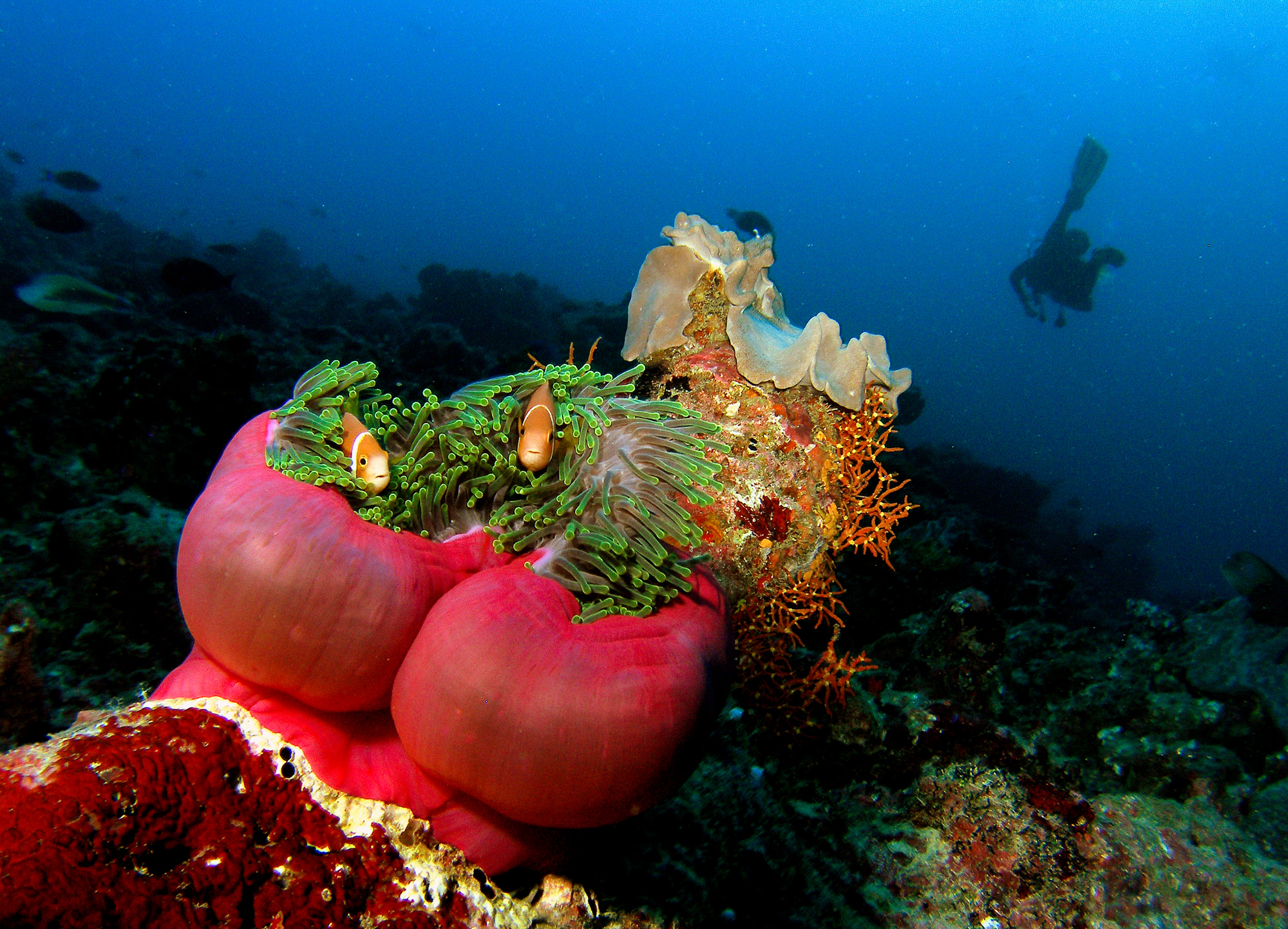 "Tot cercant el tauró balena als fons de Maamagili, nedàvem expectants per l’extrem de l’escull, mirant el blau de l’aigua. De sobte, un esclat de color i una forma força insinuant: l'anemone Heteractis magnifica, amb dos pallassos Amphiprion nigripes. Hi pot haver una troballa millor en una immersió tan blava? 'Carpe diem'..."