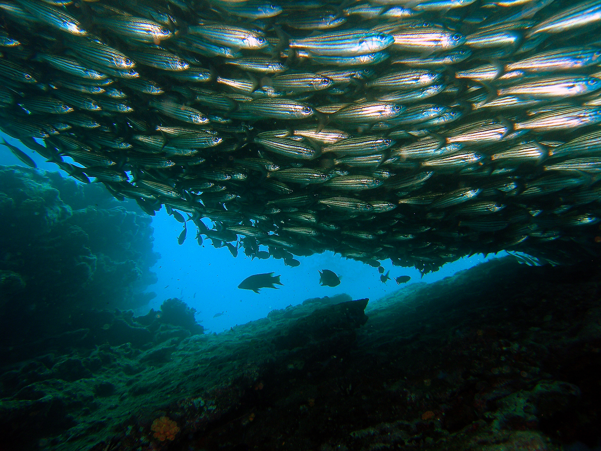 "Tornant a Santa Cruz des de les illes del nord de Galápagos, ens vam aturar en una roca petita, Cousin's Rock, al nord de l’illa Bartolomé. Enlluernats pel que havíem vist a Darwin i Wolf, res no ens feia pensar que gaudiríem d’una de les millors immersions de Galàpagos. Allò més espectacular va ser una mola immensa de Xenocys jessiae, una espècie endèmica de Galàpagos coneguda també com a Salema de ratlles negres. Milers d’individus nedant plegats fent un el·lipsoide que s’obria i tancava per la nostra presència, deixant-nos en la foscor. La fotografia està feta amb una Olympus C7070WZ, amb una carcassa PT27 i un flash extern Epoque ES-230DS."