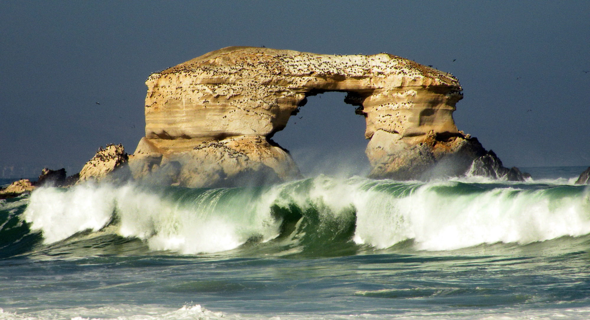 "L’arc d'Antofagasta, anomenat de La Portada, es troba a pocs metres de la platja, colpejat sense descans per les sempre temibles onades que amb el pas de milers d’anys han donat lloc a aquesta formació rocosa tan singular. Testimoni solitari de l'inexorable pas del temps, convida a passar-hi per sota i endinsar-se oceà enllà. Niu de gavines i pelicans, aquesta roca sedimentària tan erosionada té unes dimensions colossals i una bellesa que la seva contemplació a peu de la fina sorra treu l’alè, només recuperat per la fresca i salada brisa del mar."