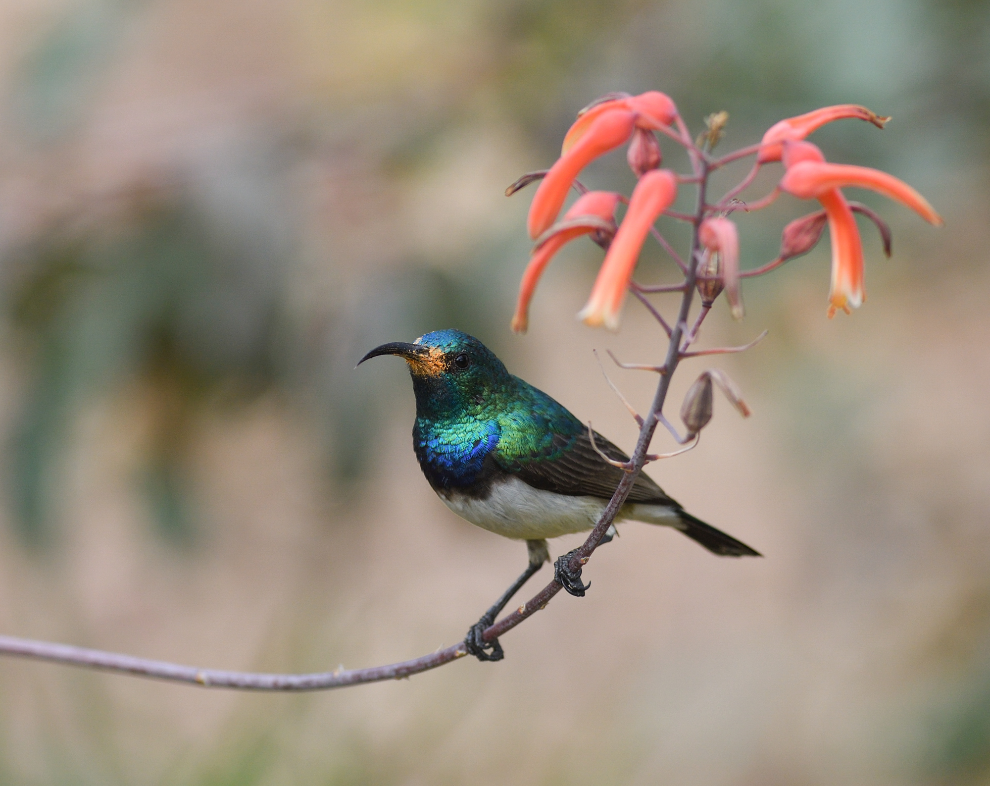 "En el plomatge d’aquest suimanga es combina el seu color natural i el del pol·len que s’ha dipositat damunt la base del seu bec després de libar una de les flors contigües. L’ocell era a una còmoda distància de 3 metres i la dificultat de la fotografia va ser enfocar-lo amb nitidesa durant els breus instants que s’hi va posar. El títol al·ludeix a la coloració de les plomes del coll i el cap. El qualificatiu de metàl·lic fa referència a la brillantor dels colors, però potser seria més adequat anomenar-lo 'nanofotònic' perquè sembla que és la nanoestructura de les plomes la que confereix aquests colors al suimanga."