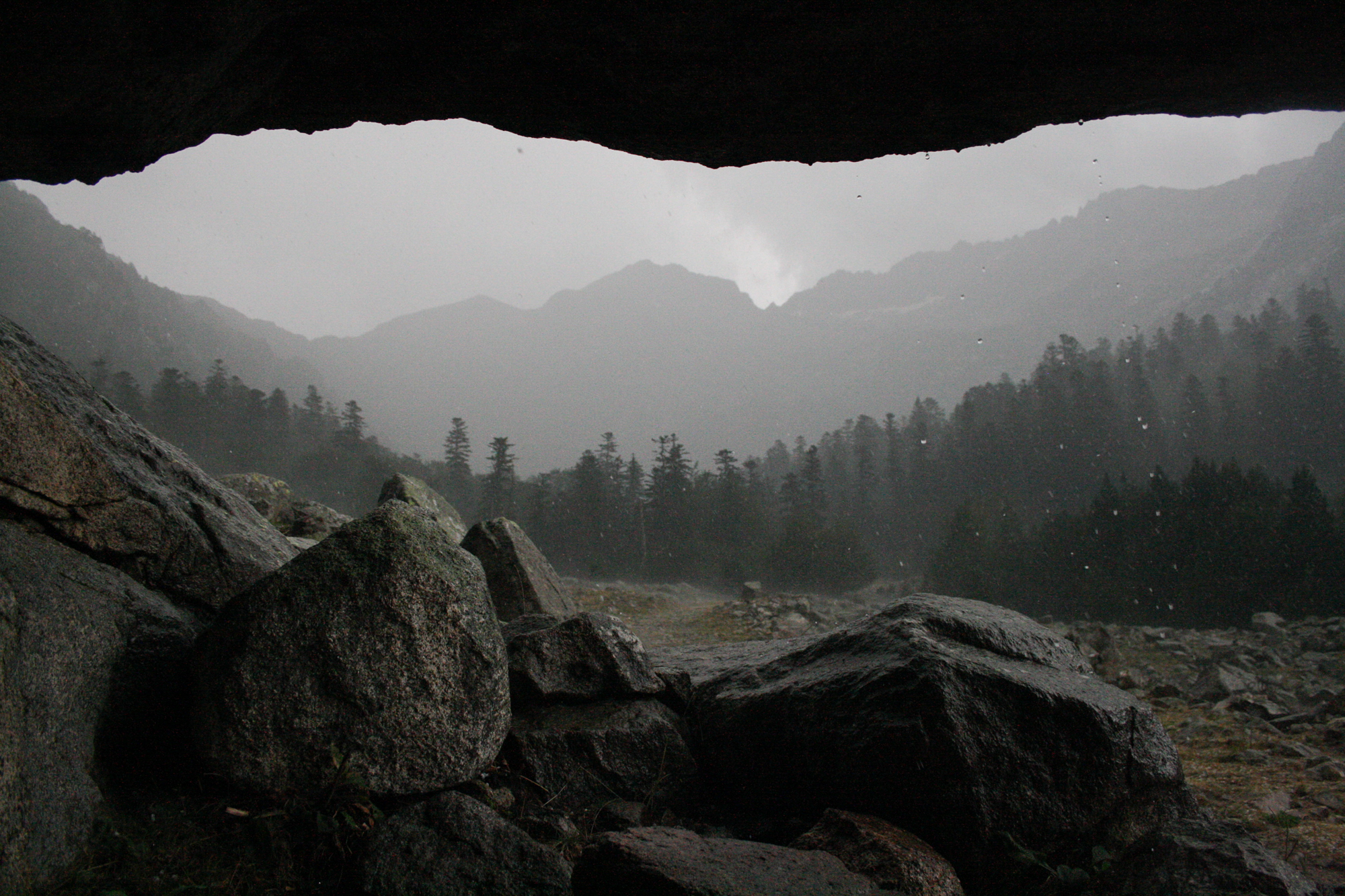 "Aquesta foto vaig fer-la un dia d'excursió amb la família, de tornada al cotxe, poca estona després que el cel comencés a tapar-se mentre érem encara a la carena. Les primeres gotes van ser l'excusa perfecta per separar-me dels altres i començar a córrer muntanya avall. Quan vaig ser a baix al bosc, el plugim va passar a pluja, i als trons van sumar-s'hi llamps, que amenaçaven de caure en qualsevol dels arbres que es creuaven al meu camí. Vaig abaixar el cap i vaig accelerar la cursa, perdent de vista el camí vàries vegades. Anava en direcció a la tempesta, davant meu el bosc es feia més dens i els llamps il·luminaven el meu temor d'acabar socarrimat. En arribar, per fi, a la clariana, es va afegir a la festa una calamarsa tan intensa i sobtada com l'aparició, tot just alçar la vista (i com si la mare naturalesa m'hagués llegit la ment), d'un roc enorme que formava un refugi, a la dreta del camí. Vaig córrer a aixoplugar-m'hi i, un cop acomodat i després de recuperar l'alè, els meus ulls van trobar la felicitat i la meva càmera la va caçar: La tenebrositat del paisatge hostil en harmonia amb el caliu del refugi inesperat. Jo i la muntanya."