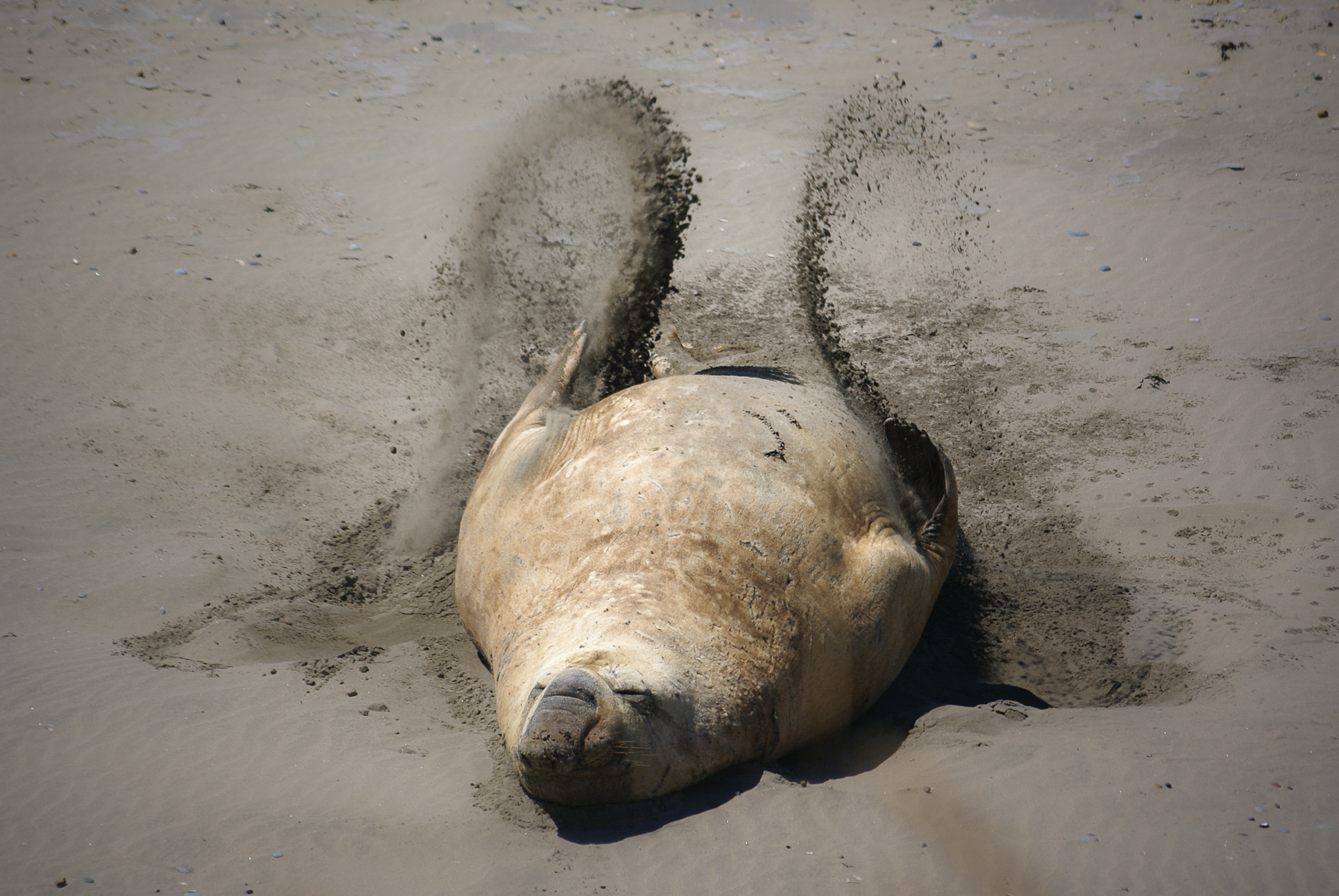 "El verd brillant de les algues i el blau profund de l'oceà contrasten amb el marró característic de l'àrida Patagònia. A mesura que ens apropem a la platja, els sons guturals dels immensos elefants marins envaeixen l'espai. La imatge és pintoresca. Grans mascles, envoltats de femelles i cries reposen al sol, indiferents a la nostra presència. Aquest mascle capta la meva atenció. En contemplar-lo m'adono que els dos estem vivint el nostre instant de goig."