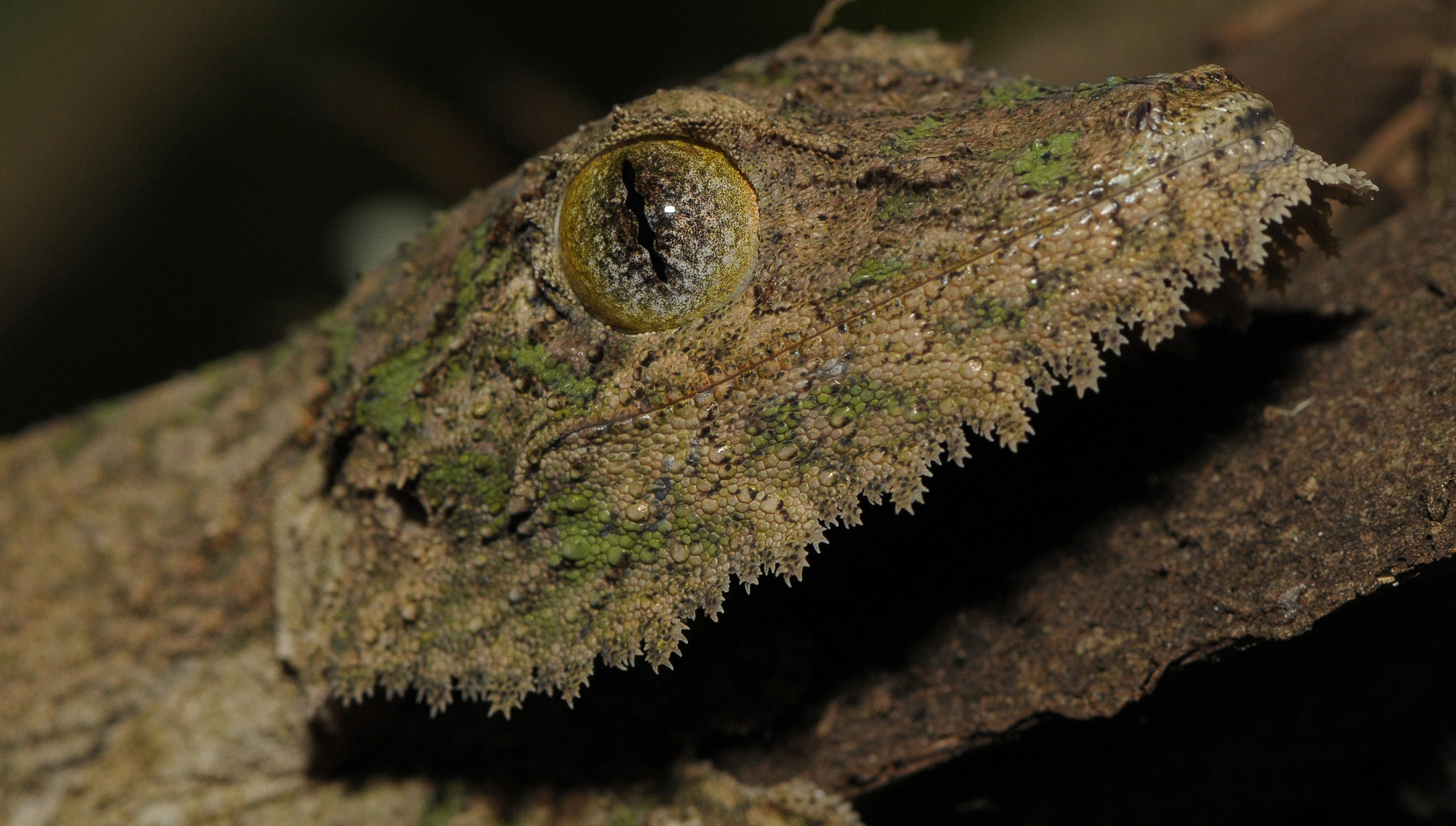 "Un camuflatge sublim, la perfecció duta a l'extrem. Els 'Leaf-tailed geckos' del gènere Uroplatus com aquest exemplar d'Uroplatus sikorae, són dragons nocturns que mimetitzen a la perfecció els colors, forma i textura de l'escorça dels arbres sobre els quals descansen immòbils durant les hores de llum. Això inclou no només el propi arbre sinó els líquens i molses que hi creixen a sobre. Durant el dia és pràcticament impossible detectar-ne un, tot i tenir-lo a un pam del nas. Al capvespre comença la seva activitat una mica avançada per la nostra presència i en desplaçar el cap, es fa evident com l'evolució ha dissenyat fins al més mínim detall el cos d'aquests dragonets per desdibuixar fins i tot els marges de la seva silueta amb unes delicades faldilles a conjunt."